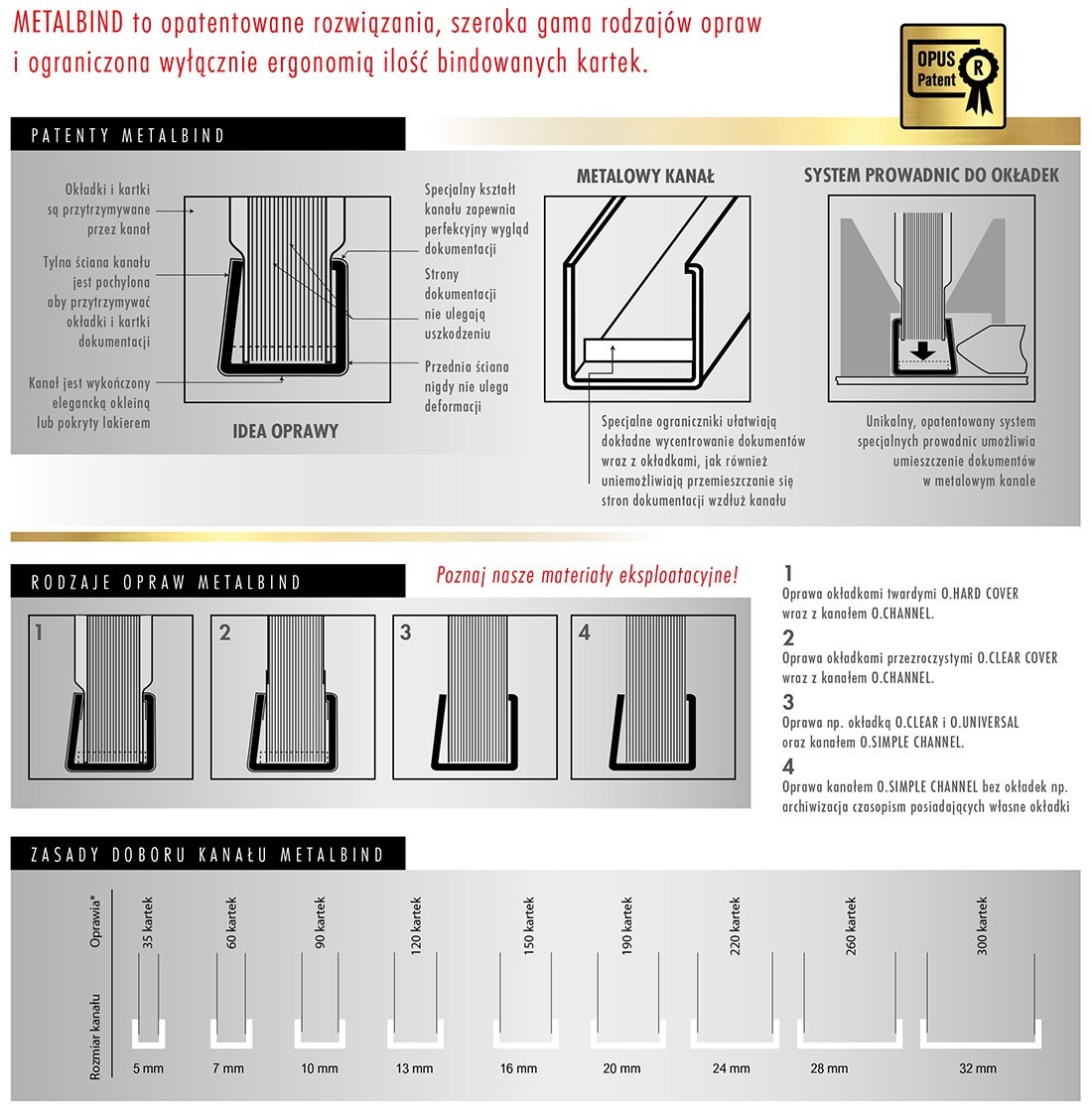 Metalowe, oklejane kanały systemu METALBIND, które w połączeniu z okładkami miękkimi lub twardymi stanowią elegancką oprawę. Okleina Classic w wyglądzie przypomina materiał wykonany z lnu.