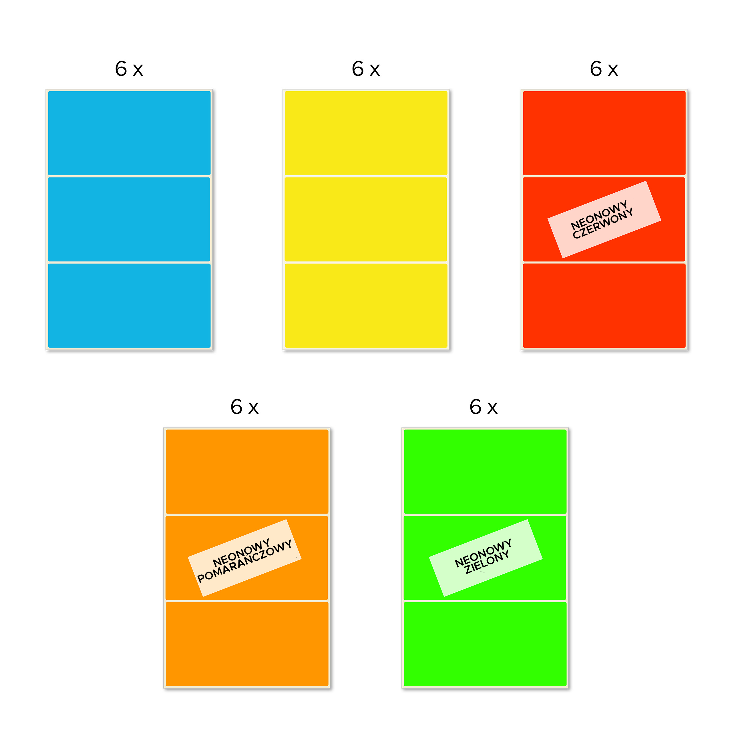 • W opakowaniu znajdują się etykiety w 5 kolorach: niebieski, żółty, neonowy zielony, neonowy pomarańczowy, neonowy czerwony