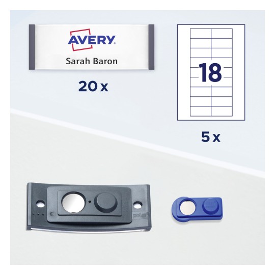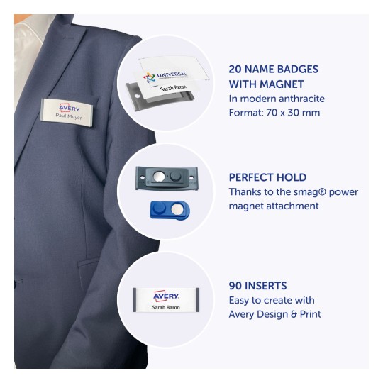 - Atrakcyjny zestaw all in one: 20 wysokiej jakości identyfikatorów imiennych 70x30 mm w nowoczesnym kolorze antracytowym, z magnetycznym mocowaniem zapobiegającym obrotom, przezroczystym panelem przednim i 5 arkuszami do druku na łącznie 90 wkładów