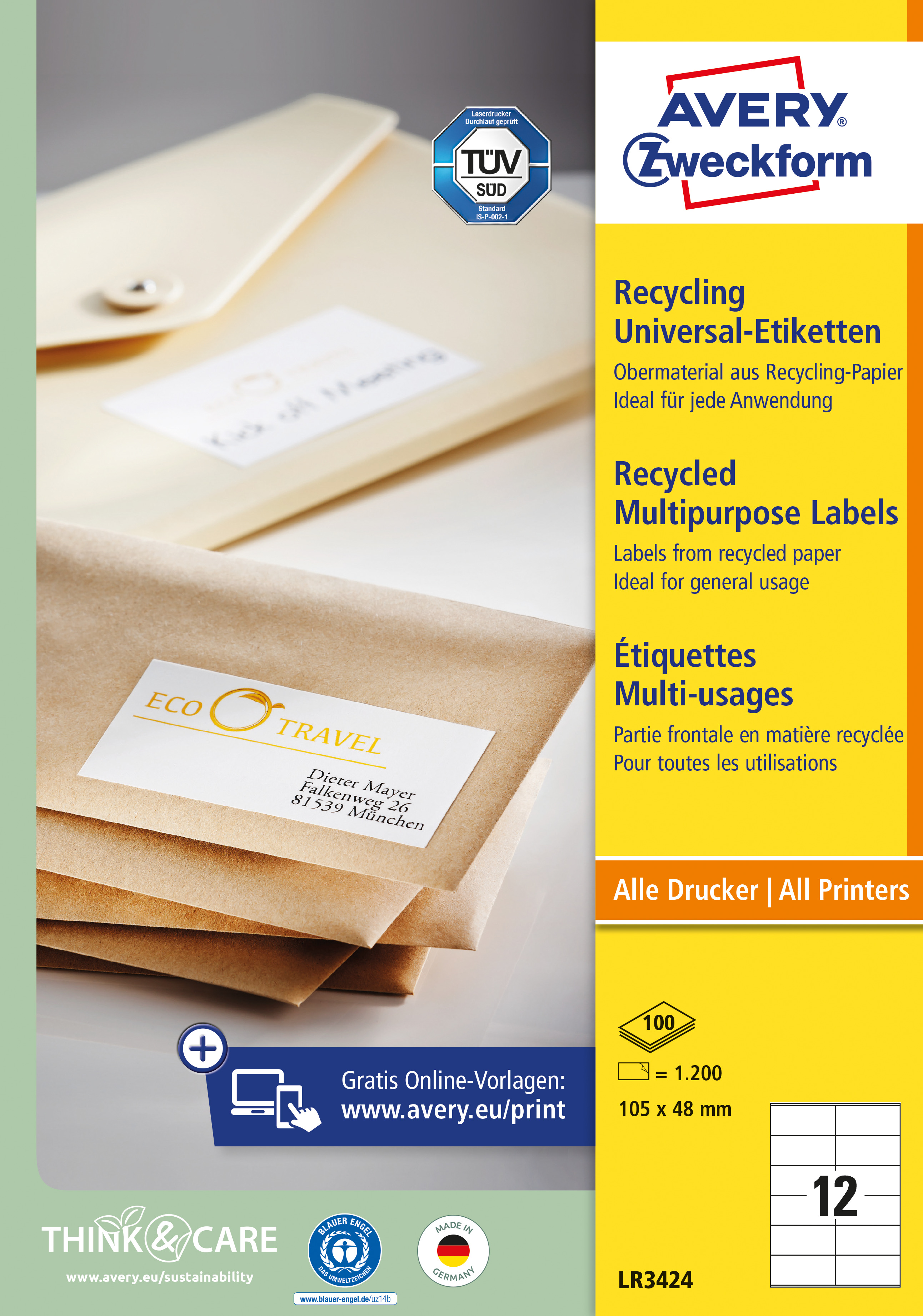 Ekologiczne, recyklingowane etykiety papierowe 105 x 48 mm, białe etykiety samoprzylepne, etykiety do druku 100 ark. / op., Avery LR3424