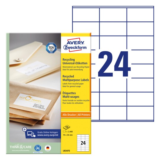 Ekologiczne, recyklingowane etykiety papierowe 70 x 36 mm, białe etykiety samoprzylepne, etykiety do druku 100 ark. / op., Avery LR3475