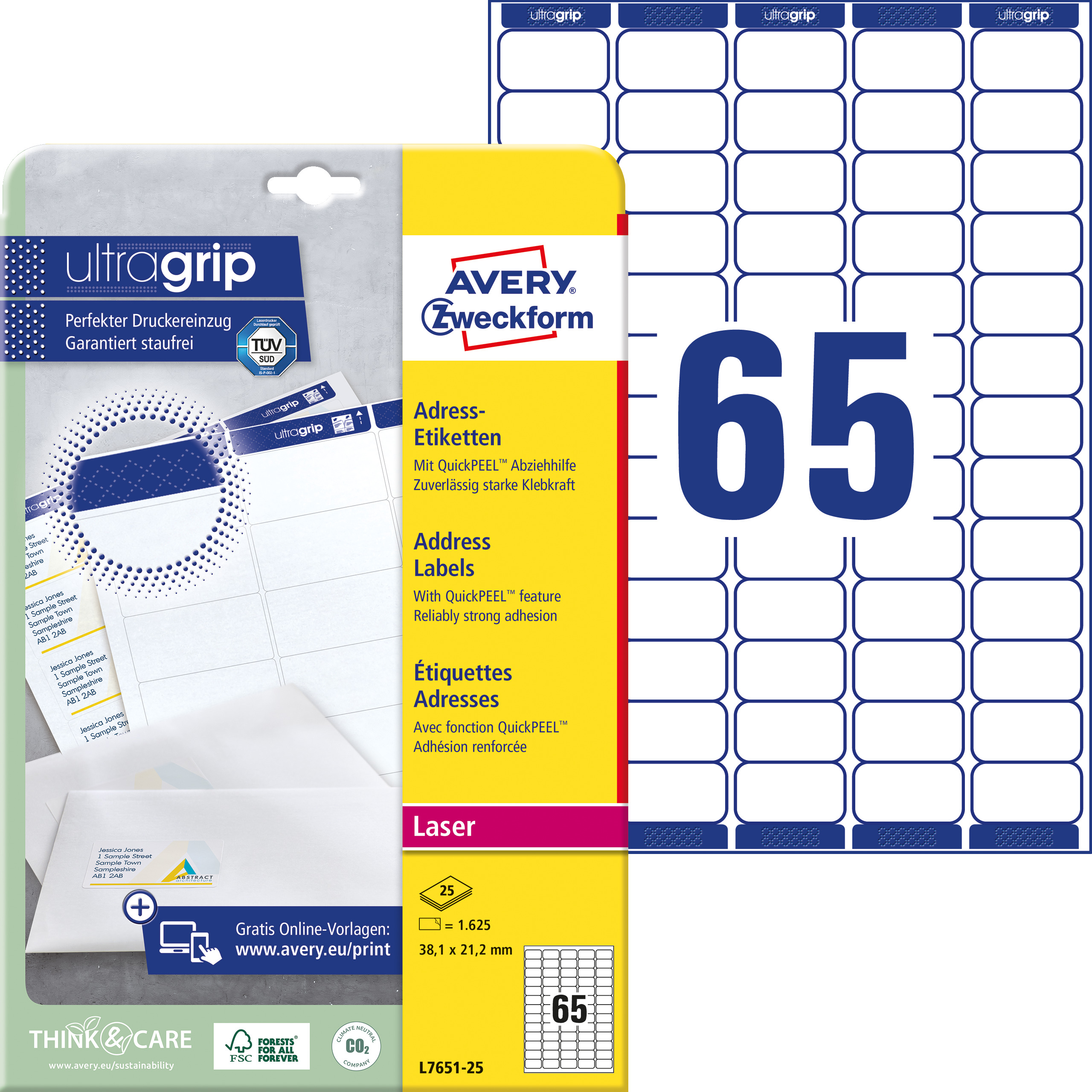 Etykiety adresowe 38,1 x 21,2 mm, białe etykiety papierowe, etykiety samoprzylepne 1.625 etyk., 25 ark. / op., sender labels, Avery L7651-25