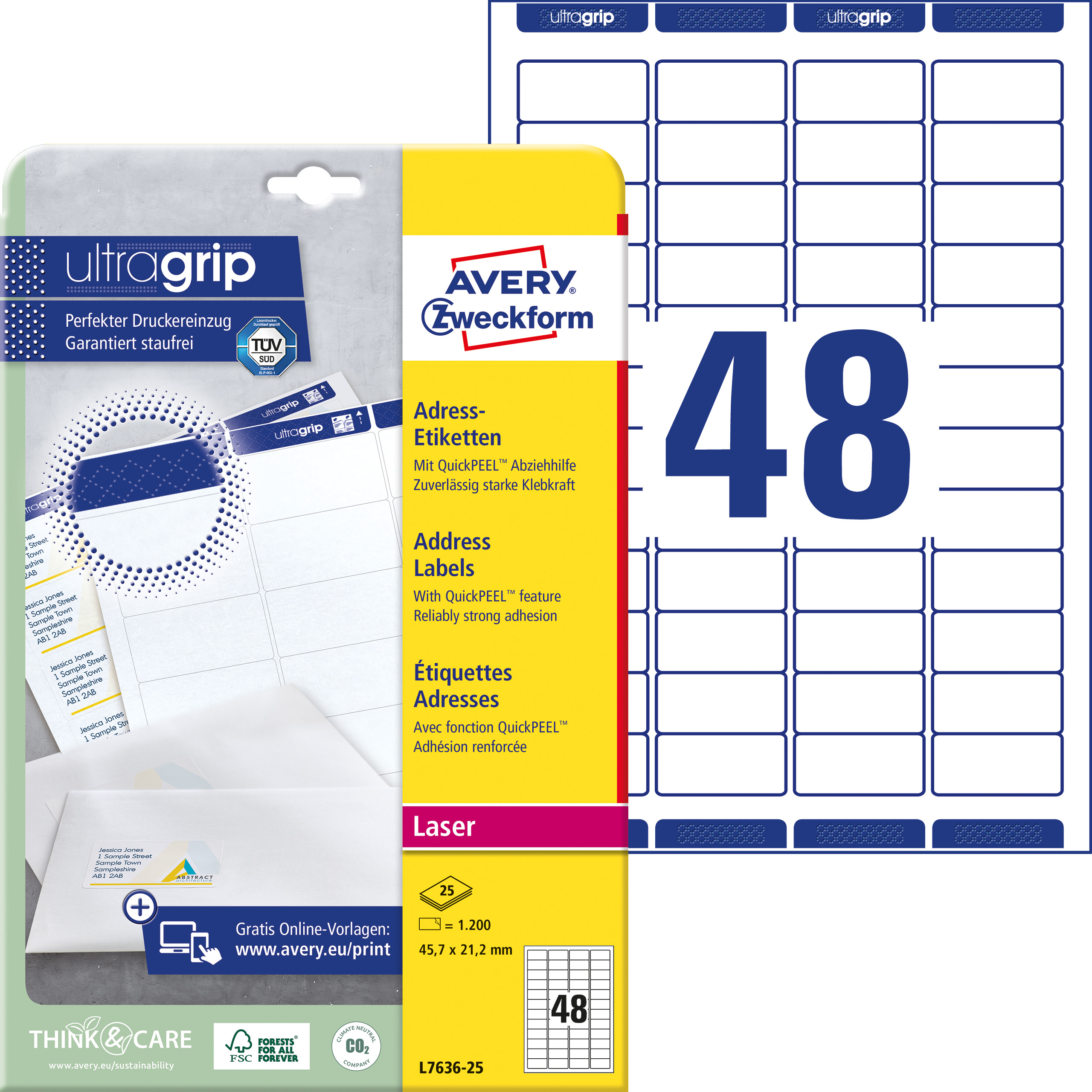 Etykiety adresowe 45,7 x 21,2 mm, białe etykiety papierowe, etykiety samoprzylepne 1.200 etyk., 25 ark. / op., sender labels, Avery L7636-25