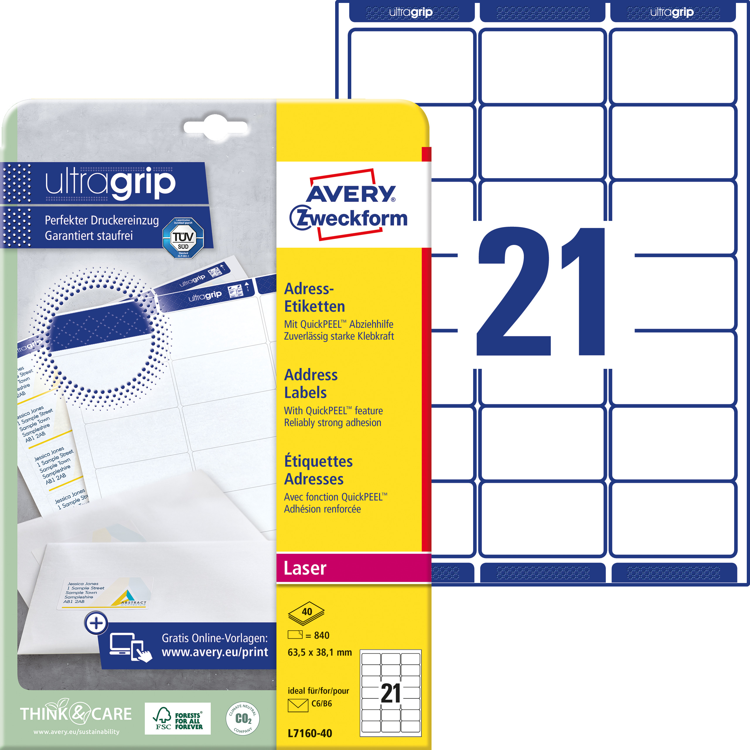 Etykiety adresowe 63,5 x 38,1 mm, białe etykiety papierowe, etykiety samoprzylepne 840 etyk., 40 ark. / op., C6 envelops, Avery L7160-40