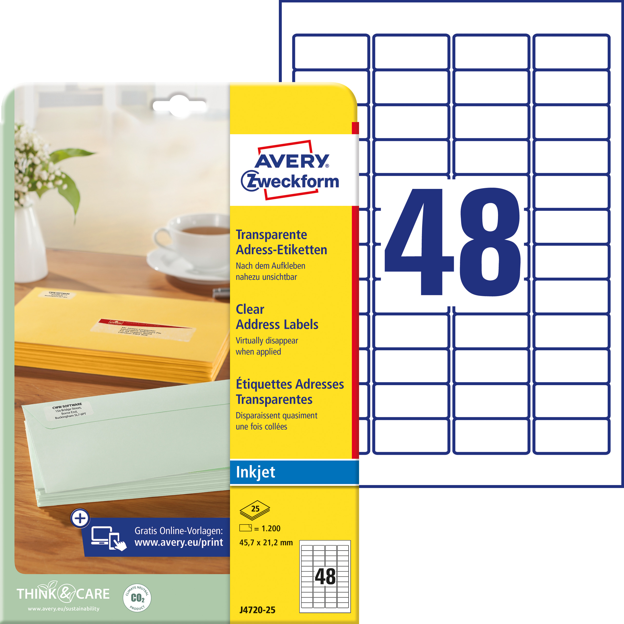 Etykiety adresowe Avery J4720-25 - 45,7 x 21,2 mm, 25 arkuszy - przeźroczysty