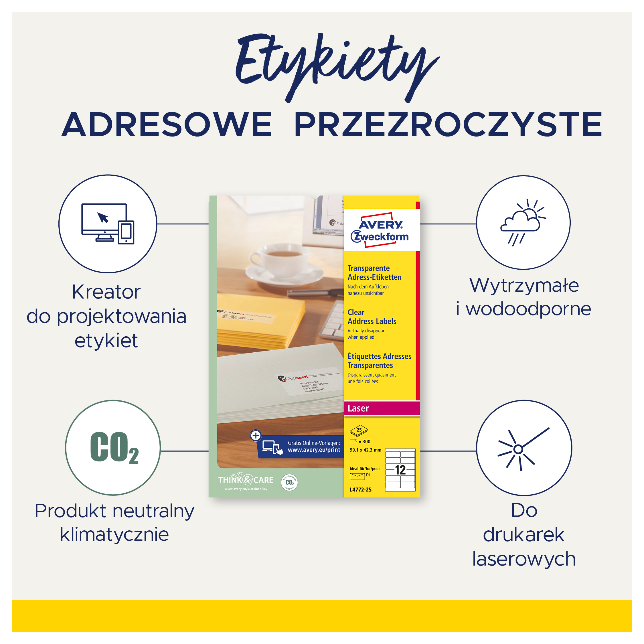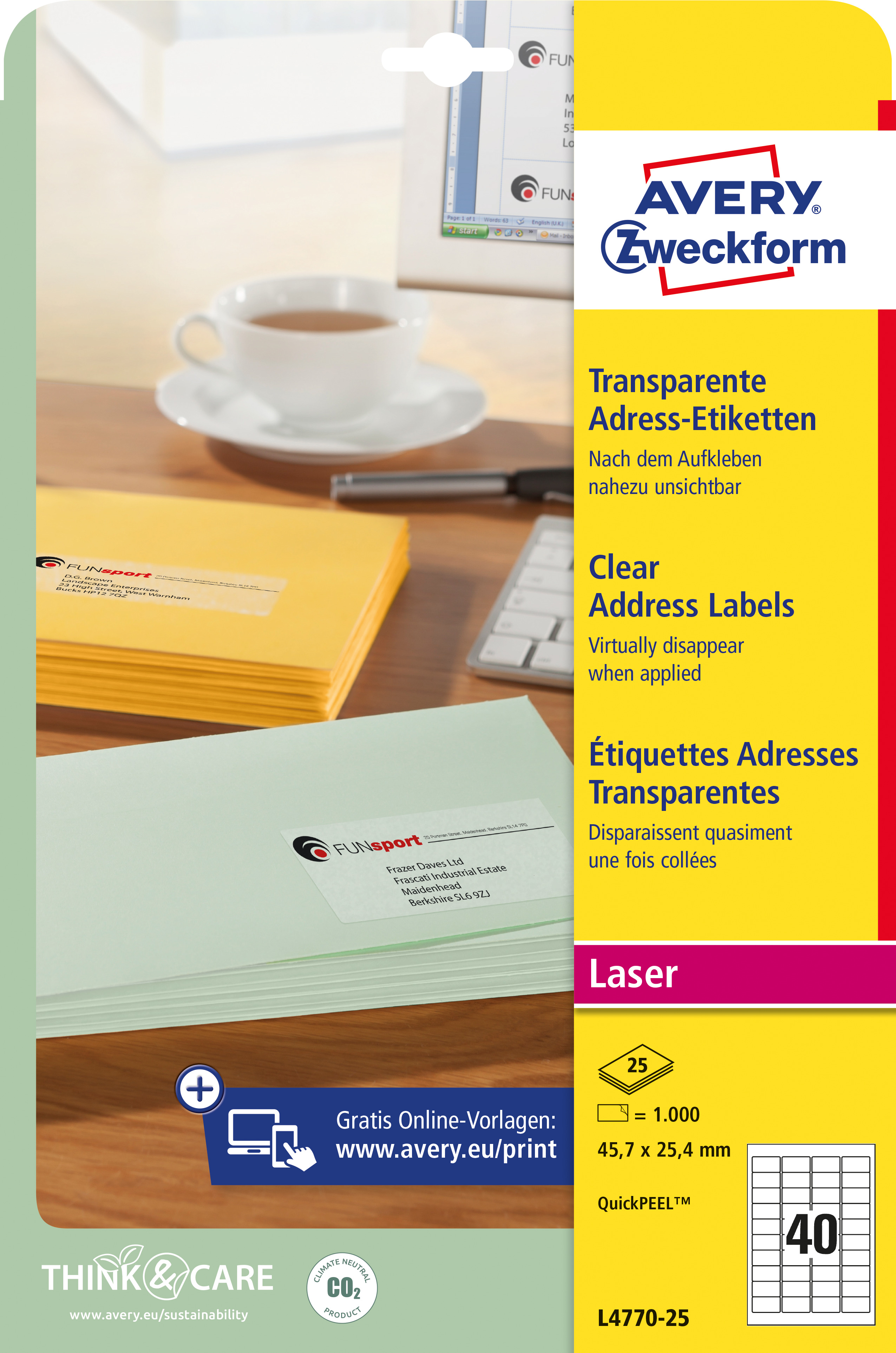 Etykiety adresowe Avery L4770-25 - 45,7 x 25,4 mm, 25 arkuszy - przeźroczysty
