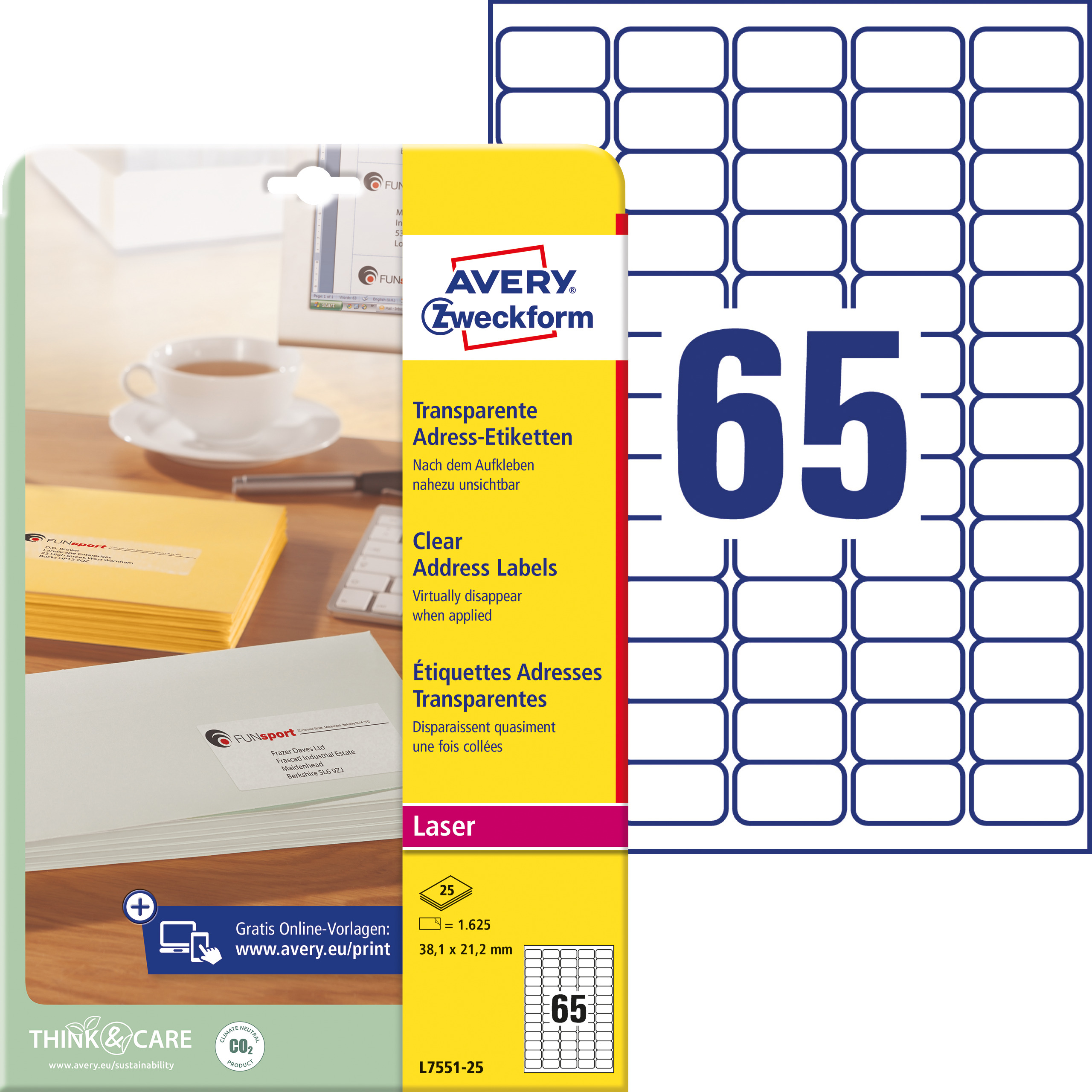Etykiety adresowe Avery L7551-25 - 38,1 x 21,2 mm, 25 arkuszy - przeźroczysty