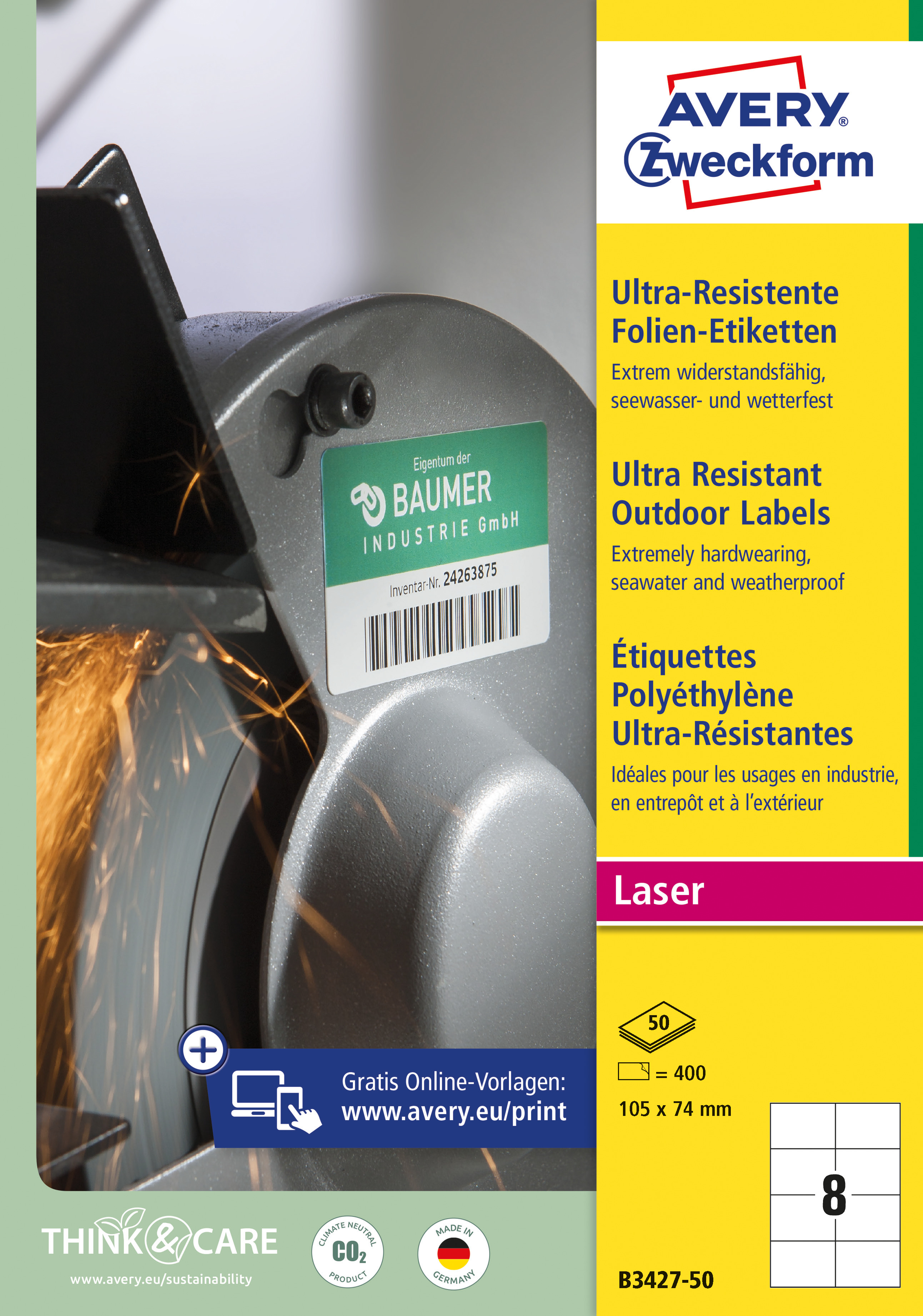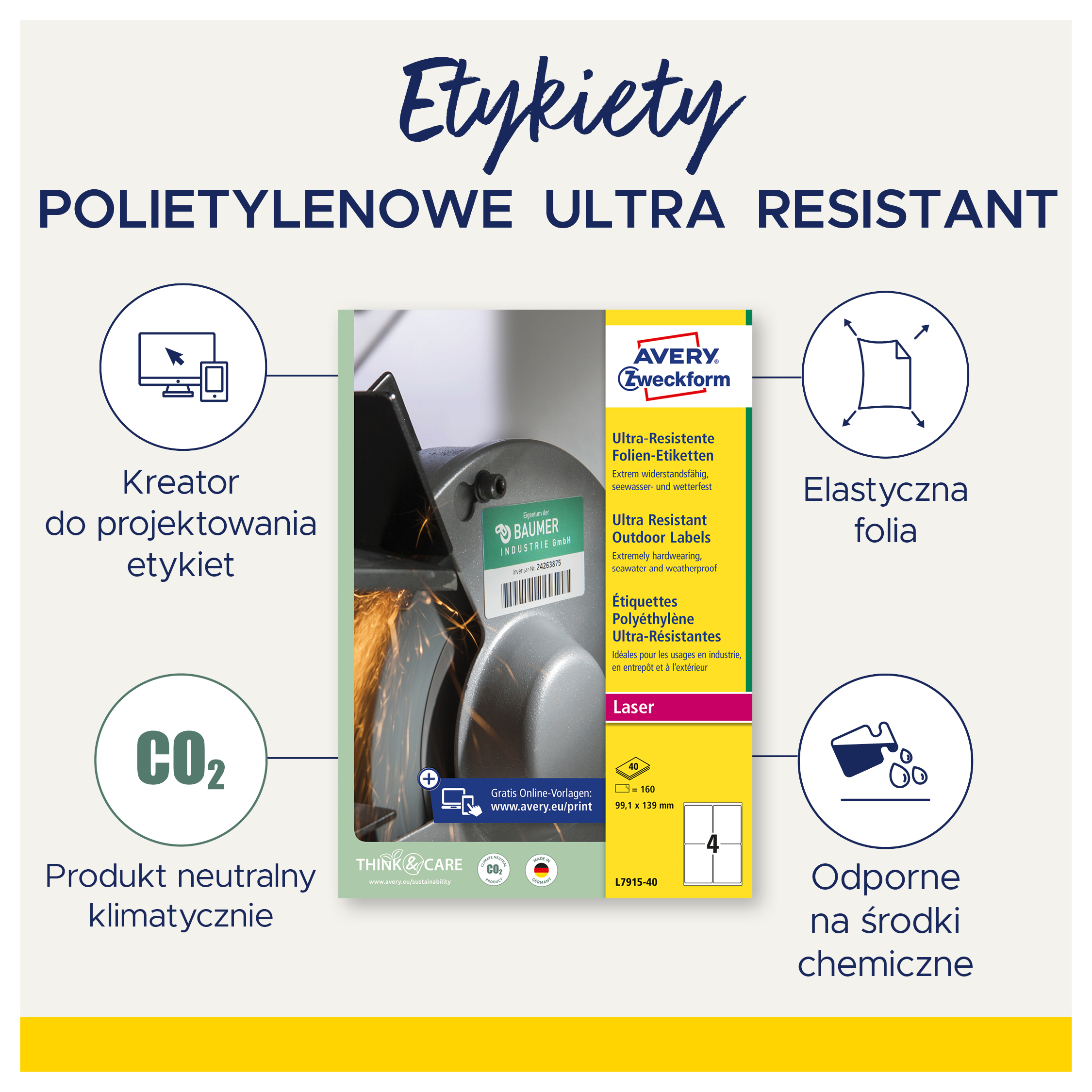 • Produkcja etykiet Avery Zweckform jest neutralna pod względem emisji CO2 (certyfikat Focus Future) i zgodna ze standardem ISO14001, który pomaga zminimalizować negatywne czynniki oddziałujące na środowisko naturalne.