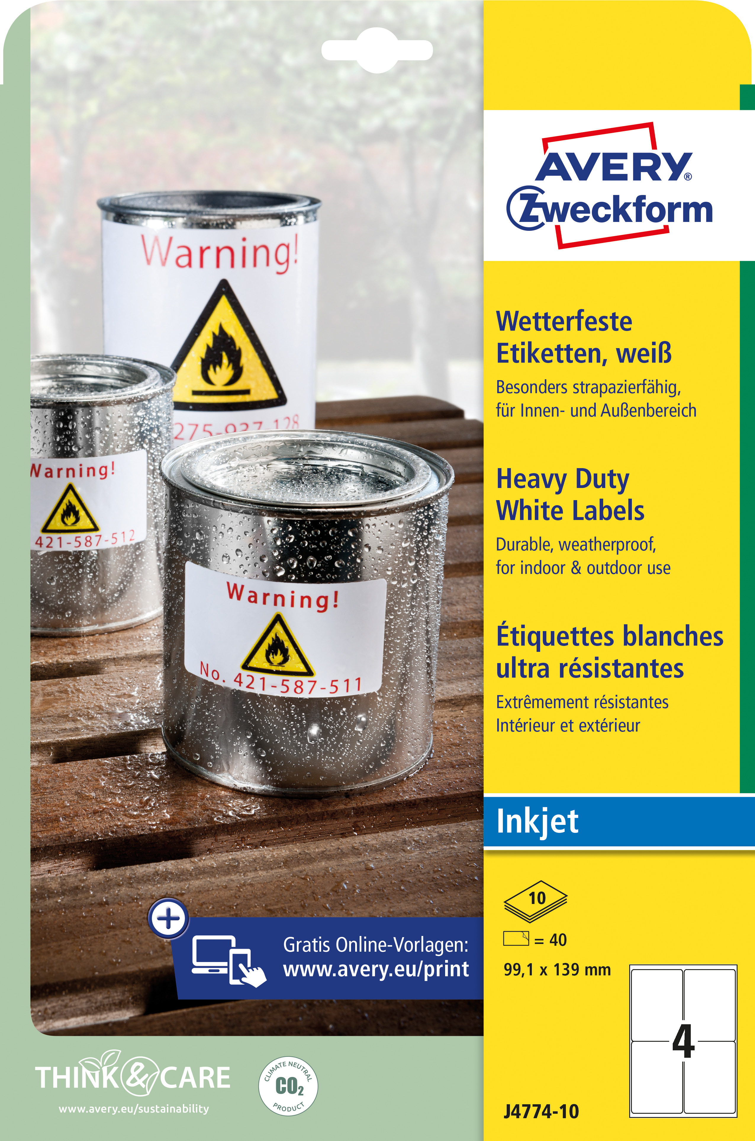 Etykiety foliowe, wodoodporne, trwałe Avery J4774-10 / 99,1 x 139 mm, 10 arkuszy - biały