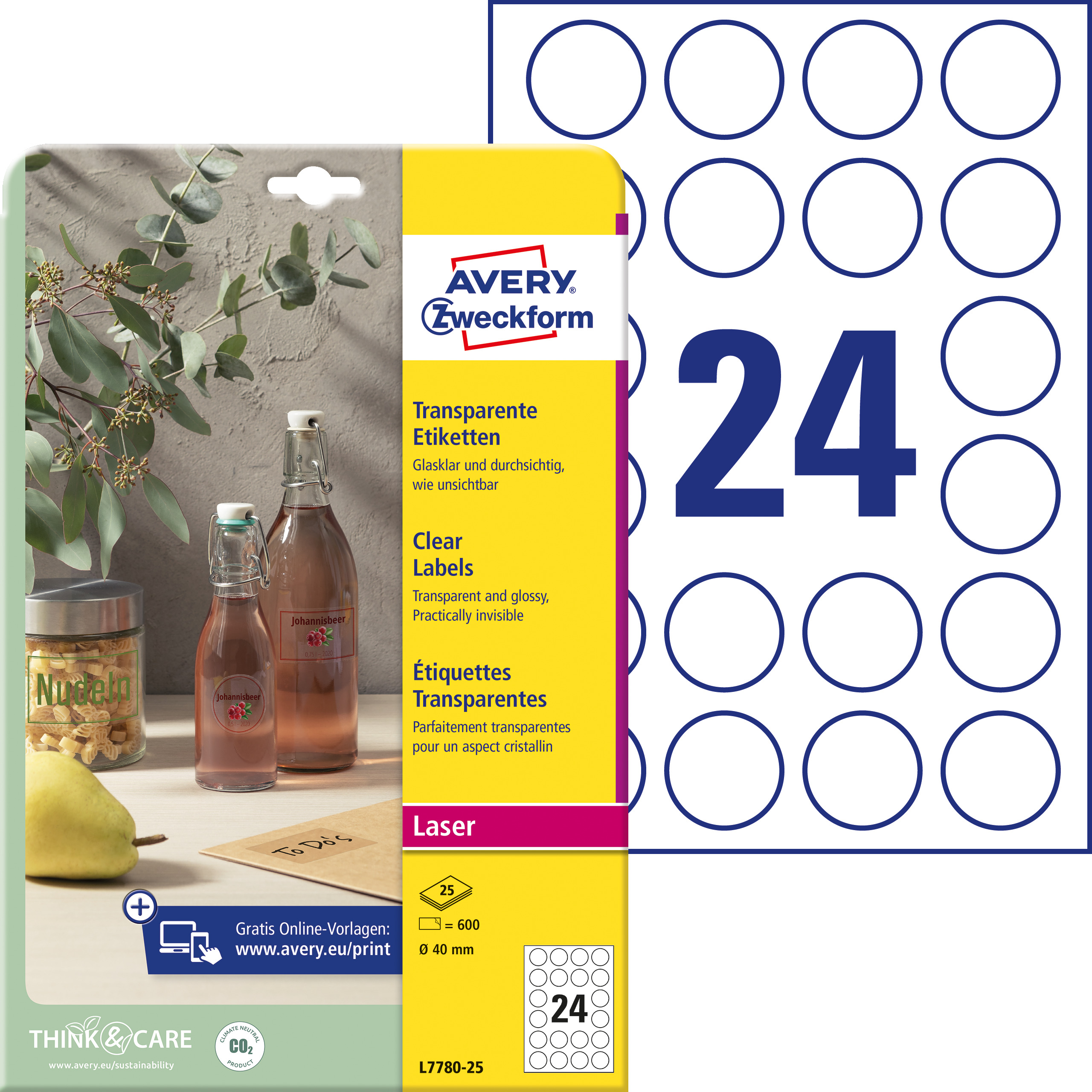 Etykiety foliowe okrągłe Avery L7780-25 - Ø 40 mm, 25 arkuszy - przeźroczysty