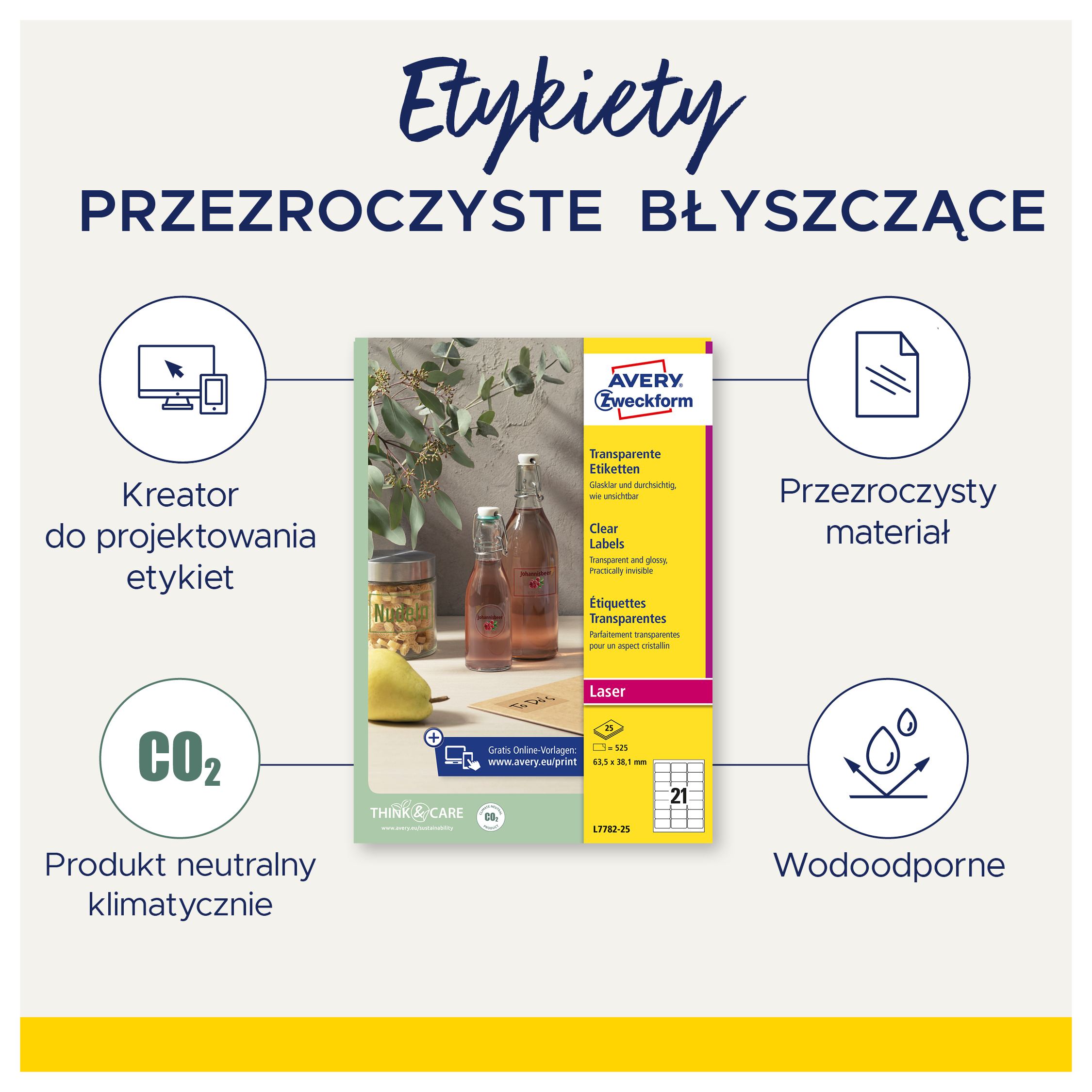 • Błyszczące etykiety wykonane z przezroczystego poliestru, zapewnią stylowy wygląd produktom.