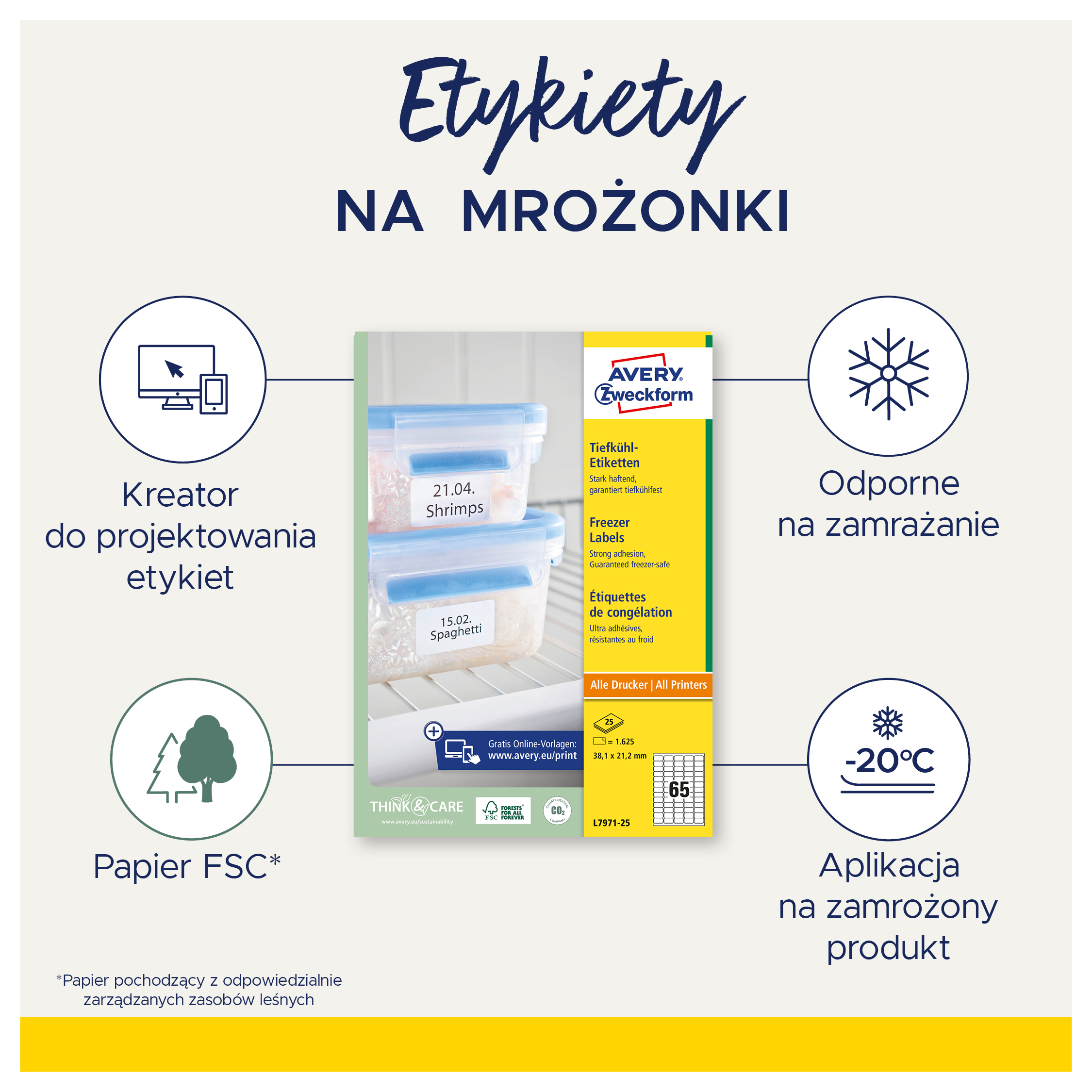 Etykiety na produkty mrożone, trwałe Avery L7970-25 / 63,5 x 33,9 mm, 25 arkuszy - biały