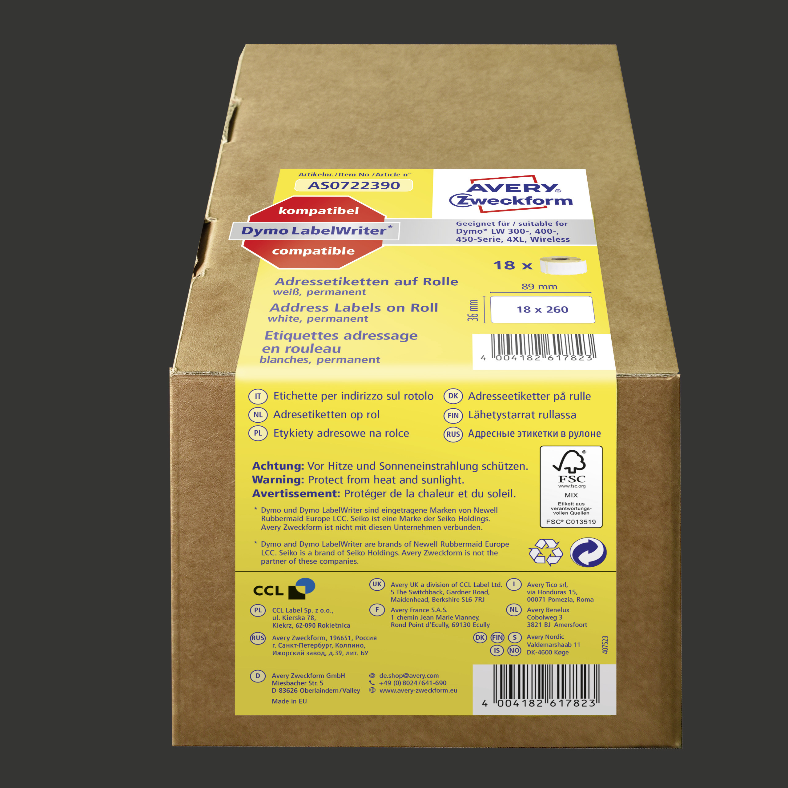 Etykiety na rolce, etykiety adresowe, do termodruku Avery AS0722390 / 36 x 89 mm, 4680 etyk. / 18 rolek - biały
