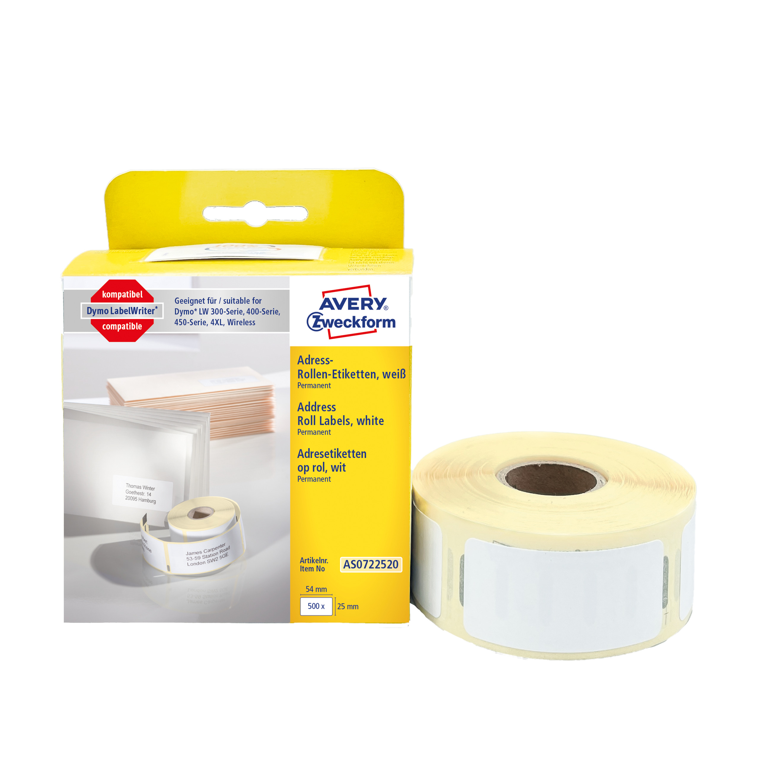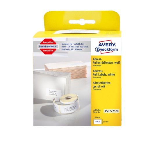 Etykiety na rolce, etykiety adresowe, do termodruku Avery AS0722520 / 25 x 54 mm, 500 etyk. / 1 rolka - biały