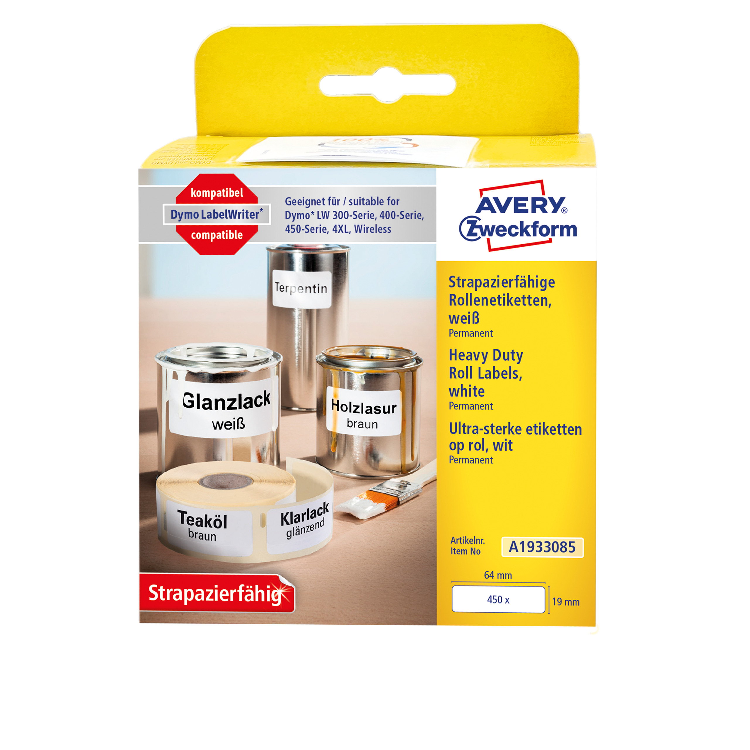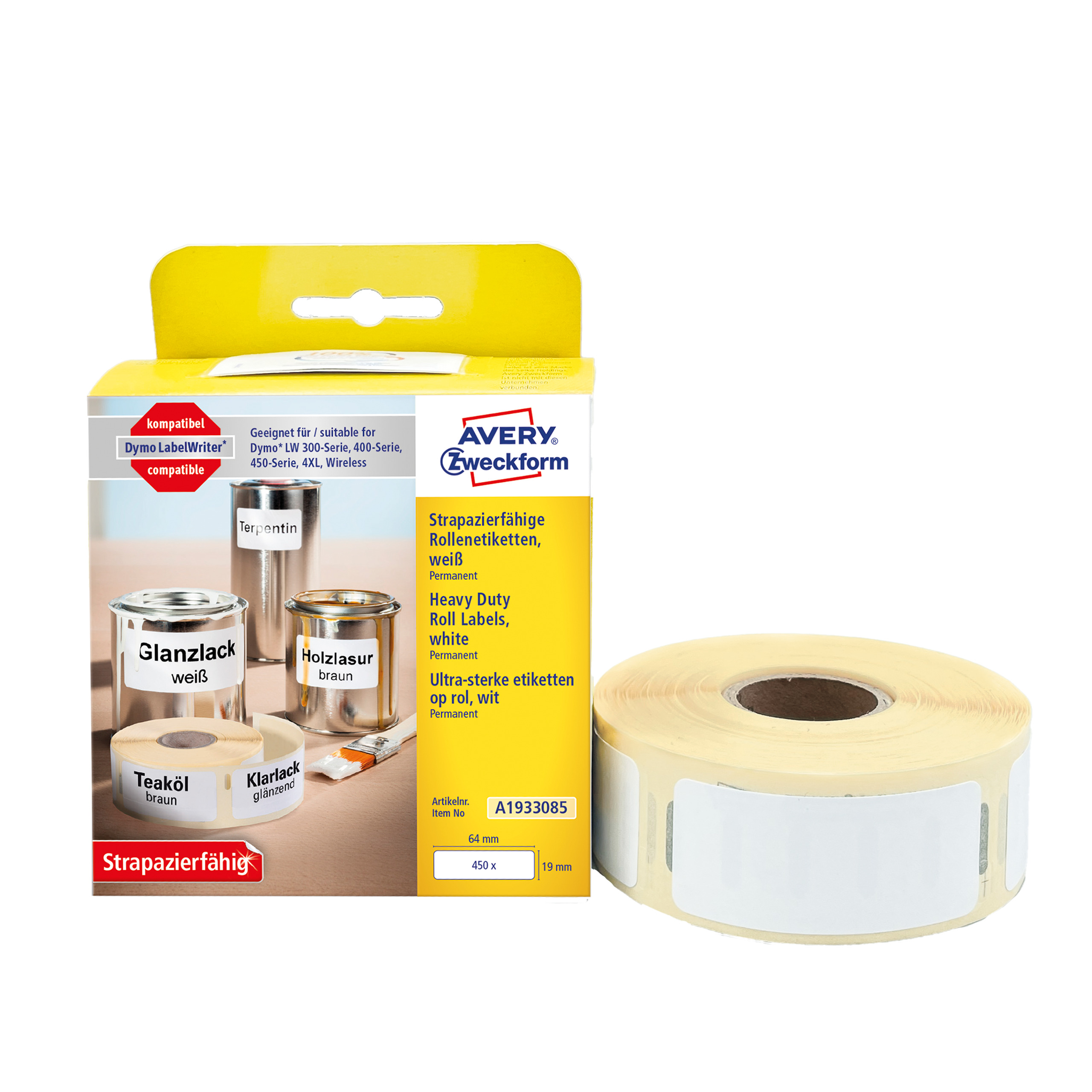 Etykiety na rolce, etykiety foliowe, etykiety do termodruku Avery A1933085 / 19 x 64 mm, 450 etyk, 1 rolka - biały