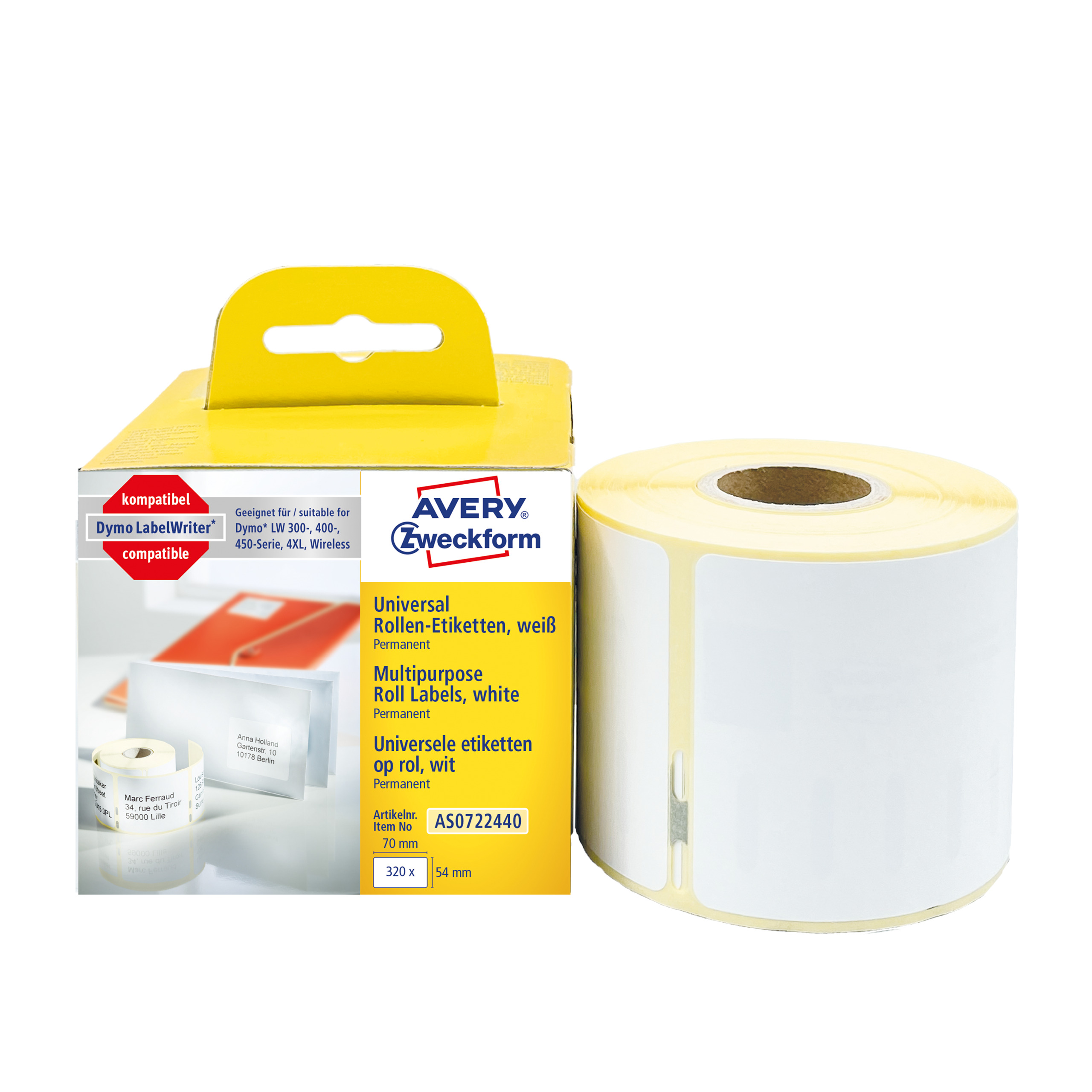 Etykiety na rolce, trwałe etykiety papierowe Avery AS0722440 / 54 x 70 mm, 320 etyk. / 1 rolka - biały