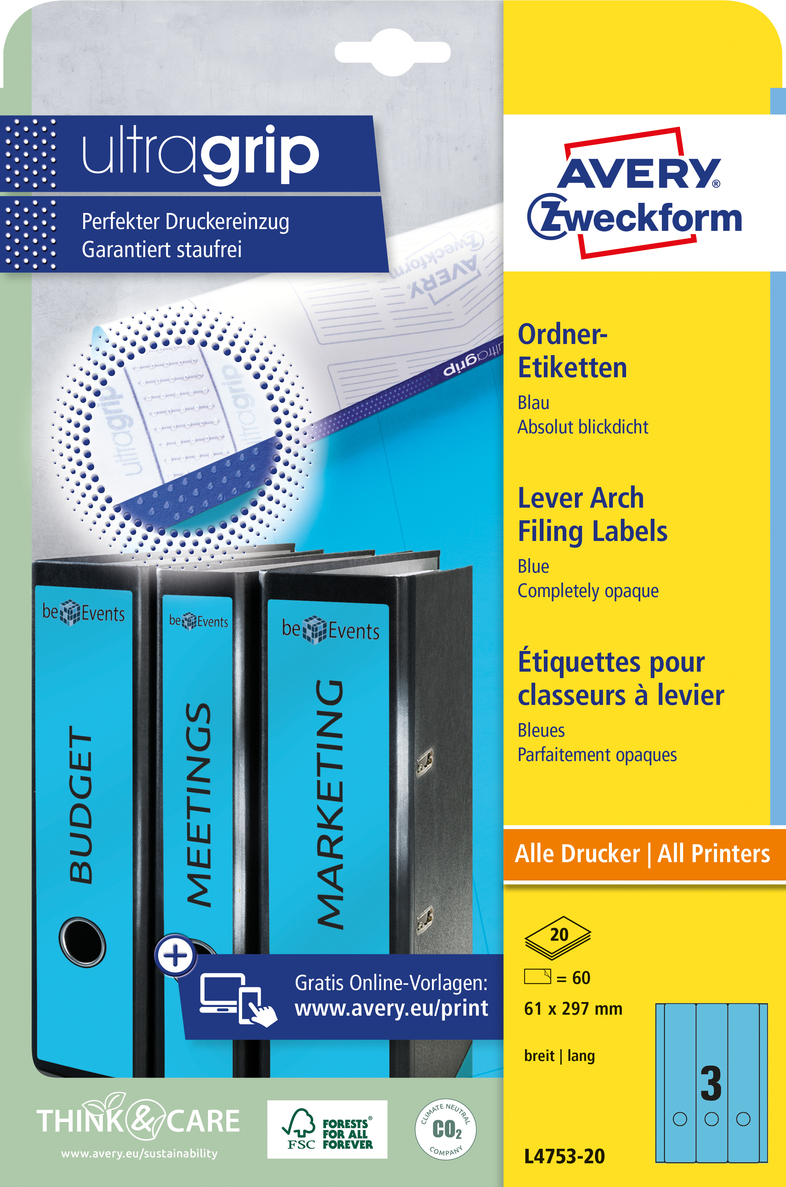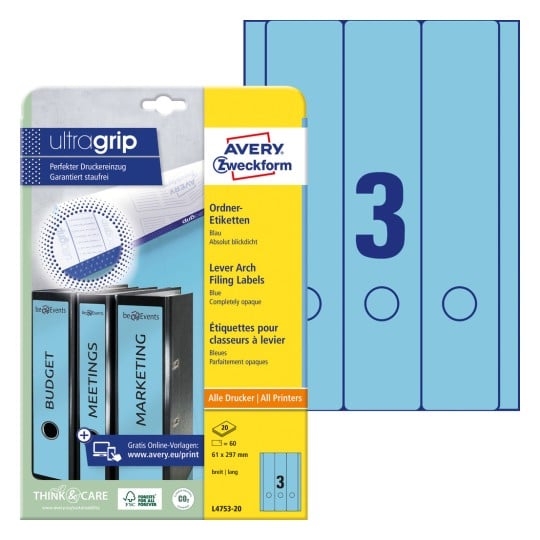 Etykiety na segregatory Avery L4753-20 - 61 x 297 mm, 20 arkuszy - niebieski