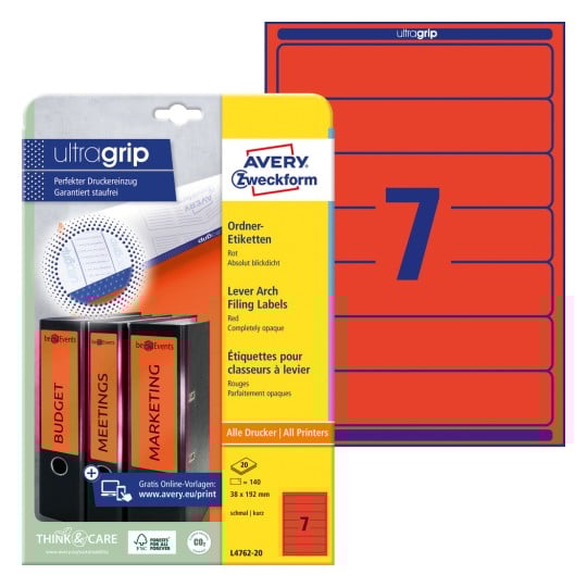 Etykiety na segregatory Avery L4762-20 - 38 x 192 mm, 20 arkuszy - czerwony