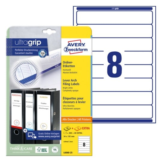 Etykiety na segregatory Avery L6060-25 - 34 x 192 mm, 30 arkuszy - biały