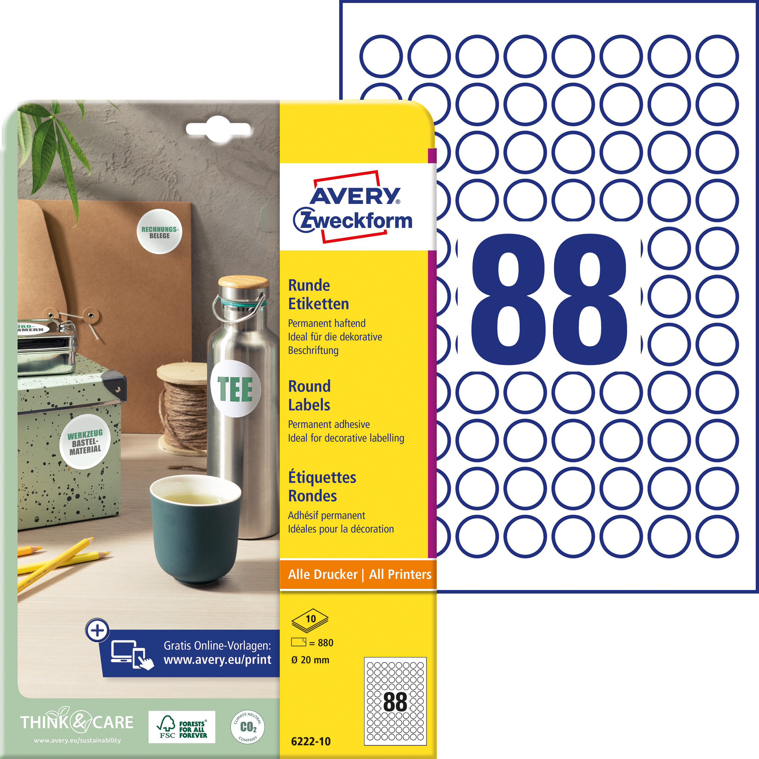 Etykiety papierowe okrągłe Avery 6222-10 - Ø 20 mm, 10 arkuszy - biały