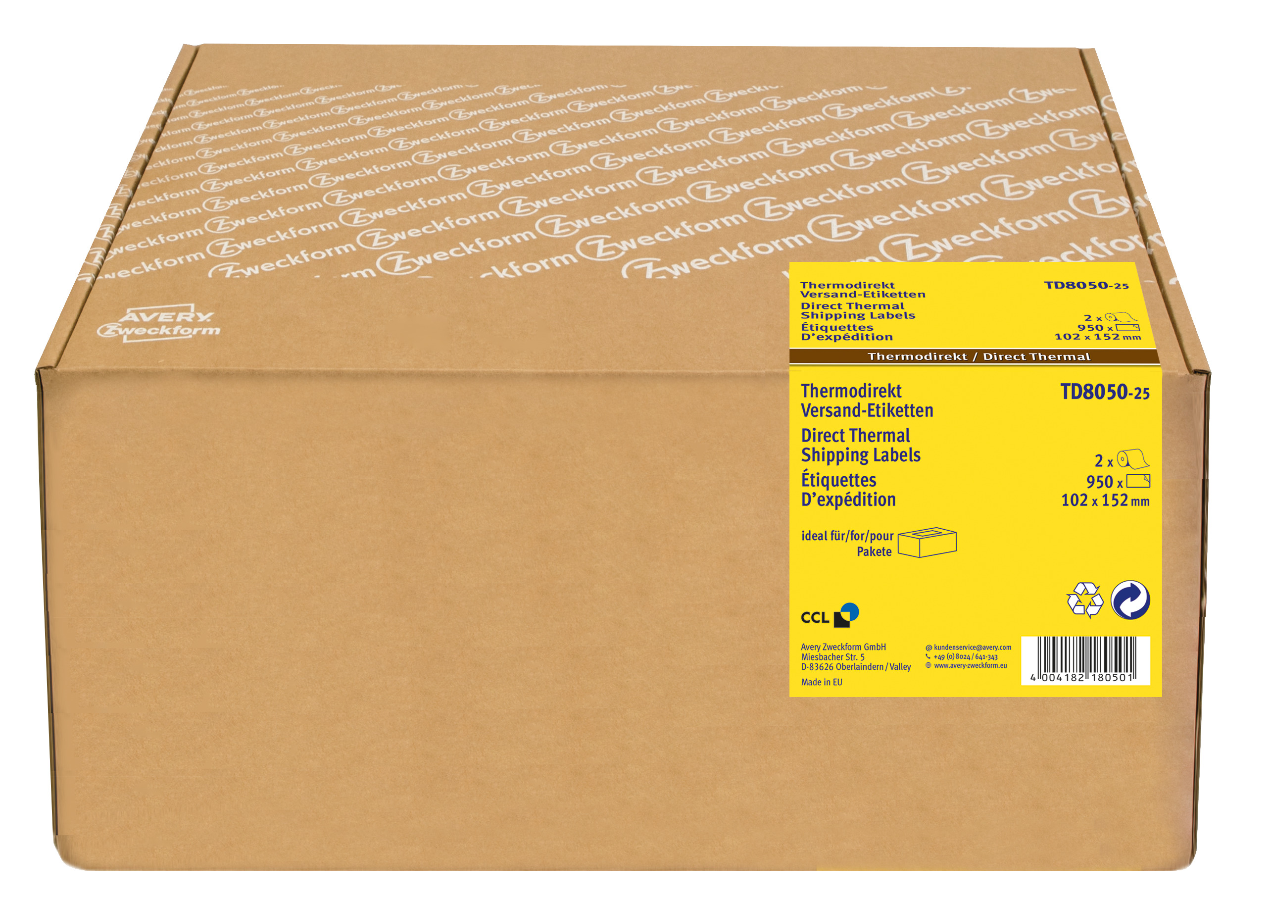 Etykiety termiczne Avery TD8050-25 - 102 x 152 mm, rdzeń 25 mm, 950 etykiet / 2 rolki - biały