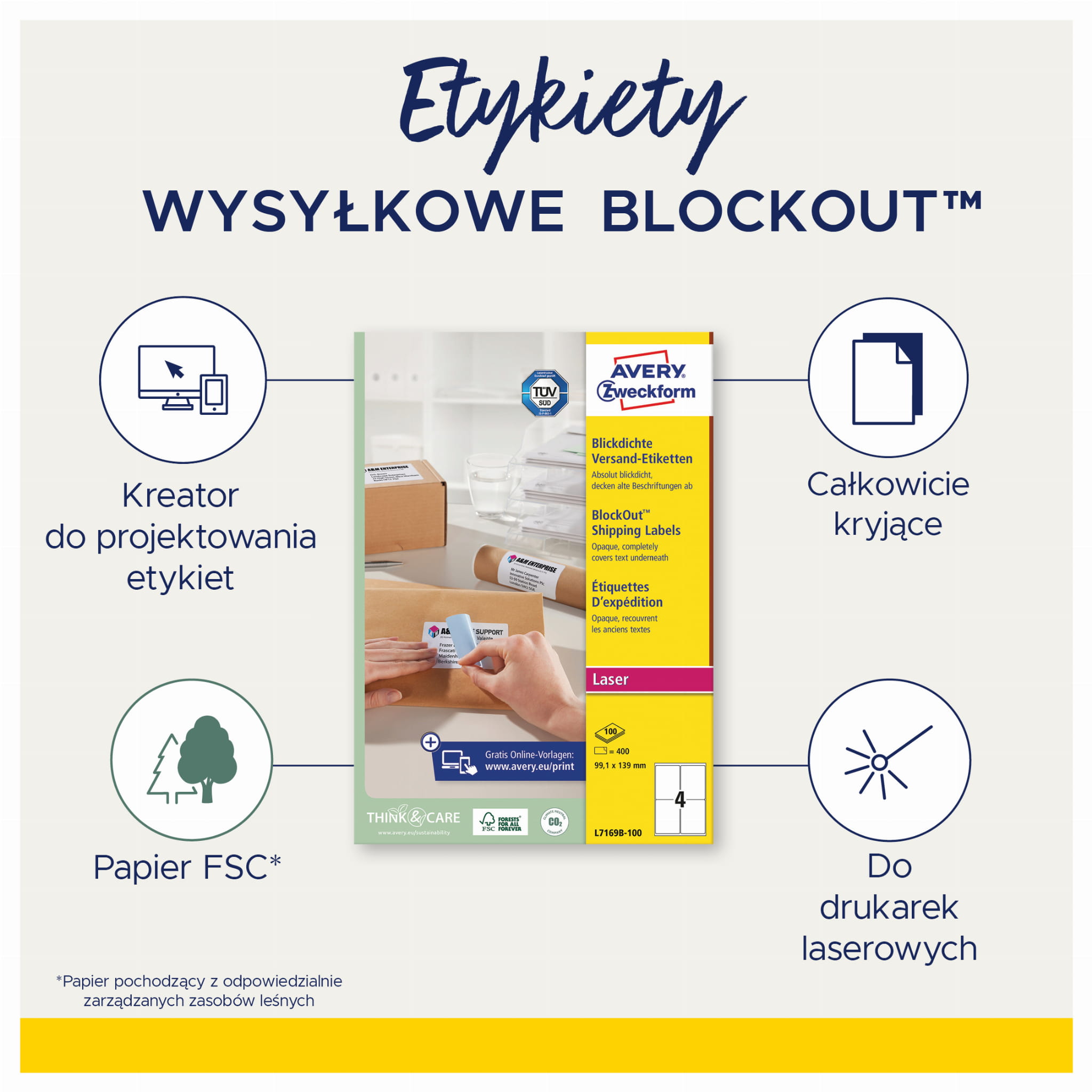 Produkt ekologiczny, przyjazny dla środowiska, z certyfikatem FSC®. Zaprojektuj i wydrukuj etykiety adresowe oraz wysyłkowe łatwo i szybko używając bezpłatnych szablonów i oprogramowania Avery Zweckform dostępnych na stronie www.avery-zweckform.pl lub użyj szablonów zintegrowanych z pakietami Microsoft® Office.