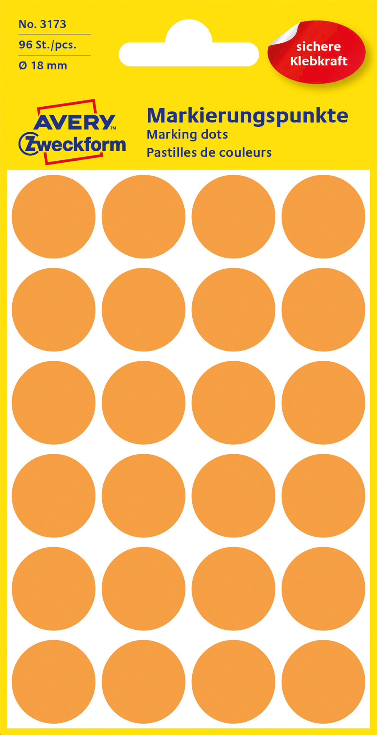 Kółka do zaznaczania Avery 3173 - Ø 18 mm, 96 etyk., 4 arkusze - pomarańczowy neonowy