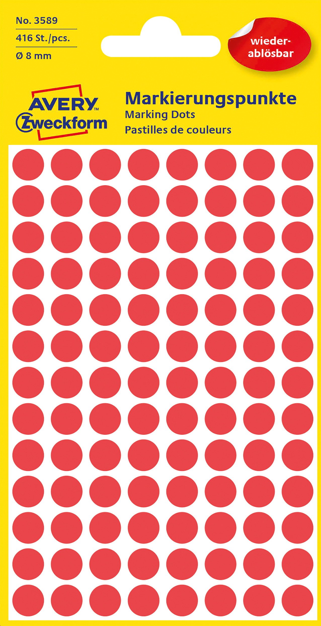 Kółka do zaznaczania usuwalne Avery 3589 - Ø 8 mm, 416 etyk., 4 arkusze - czerwony