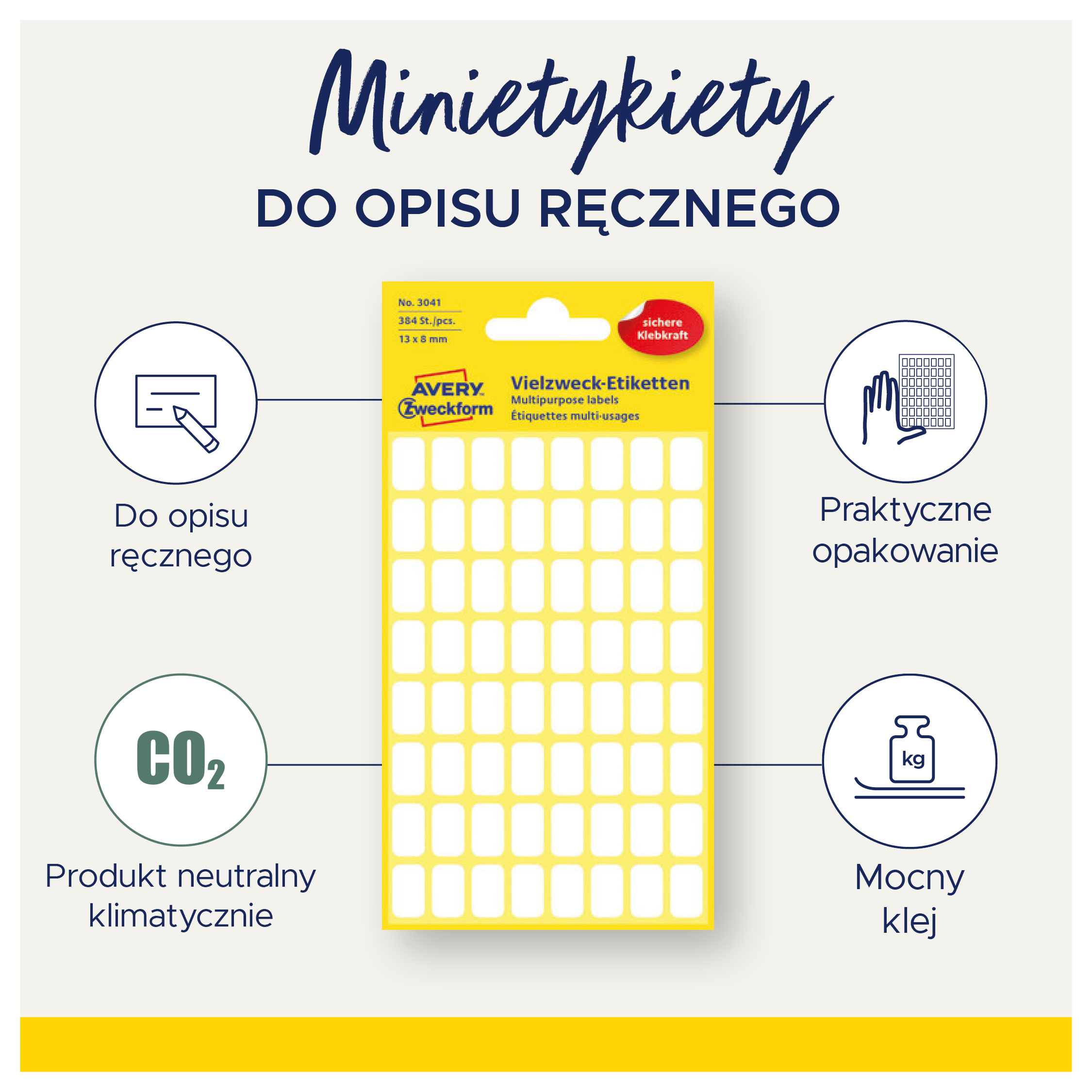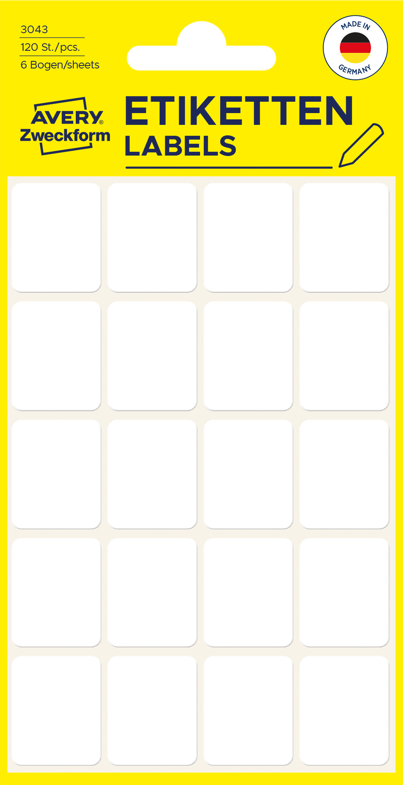 Minietykiety do opisywania ręcznego 22 x 18 mm, trwałe etykiety papierowe, białe etykiety samoprzylepne 120 etyk., 6 ark. /op., Avery 3043