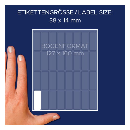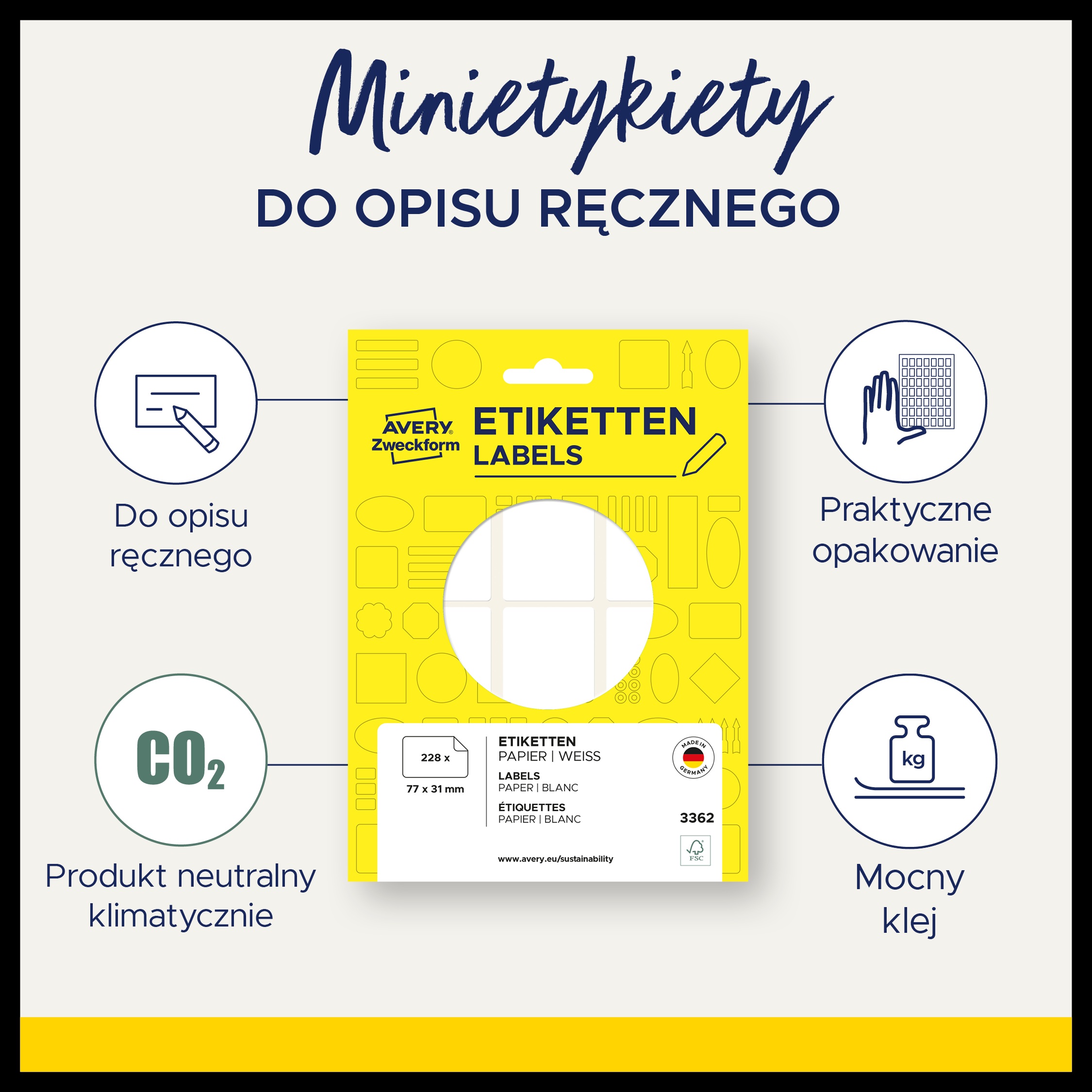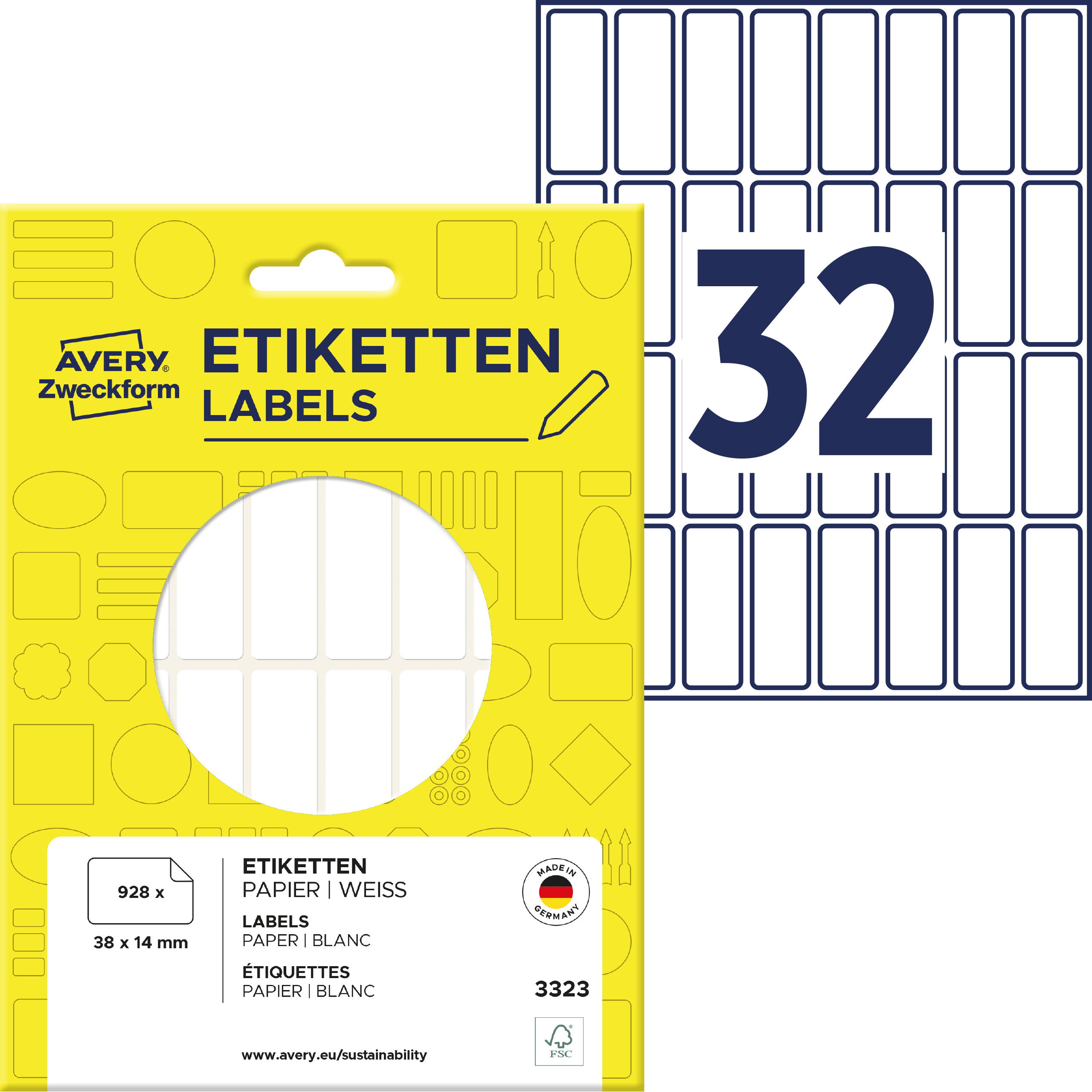 Minietykiety do opisywania ręcznego 38 x 14 mm, trwałe etykiety papierowe, białe etykiety samoprzylepne 928 etyk., 29 ark. /op., Avery 3323