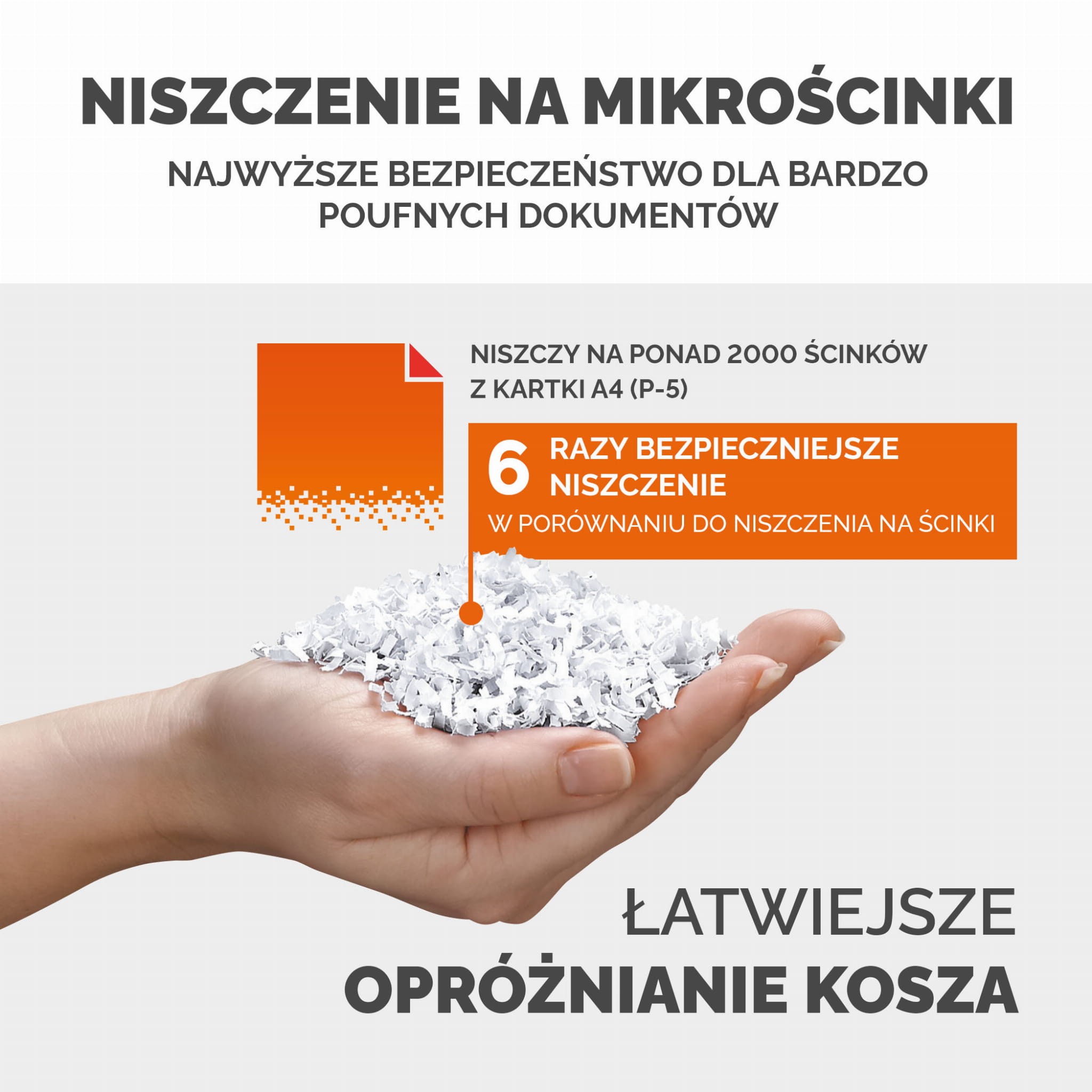 - Niszczy dokumenty na mikrościnki 2×14 mm zapewniając poziom bezpieczeństwa P-5 (wg normy DIN 66399).