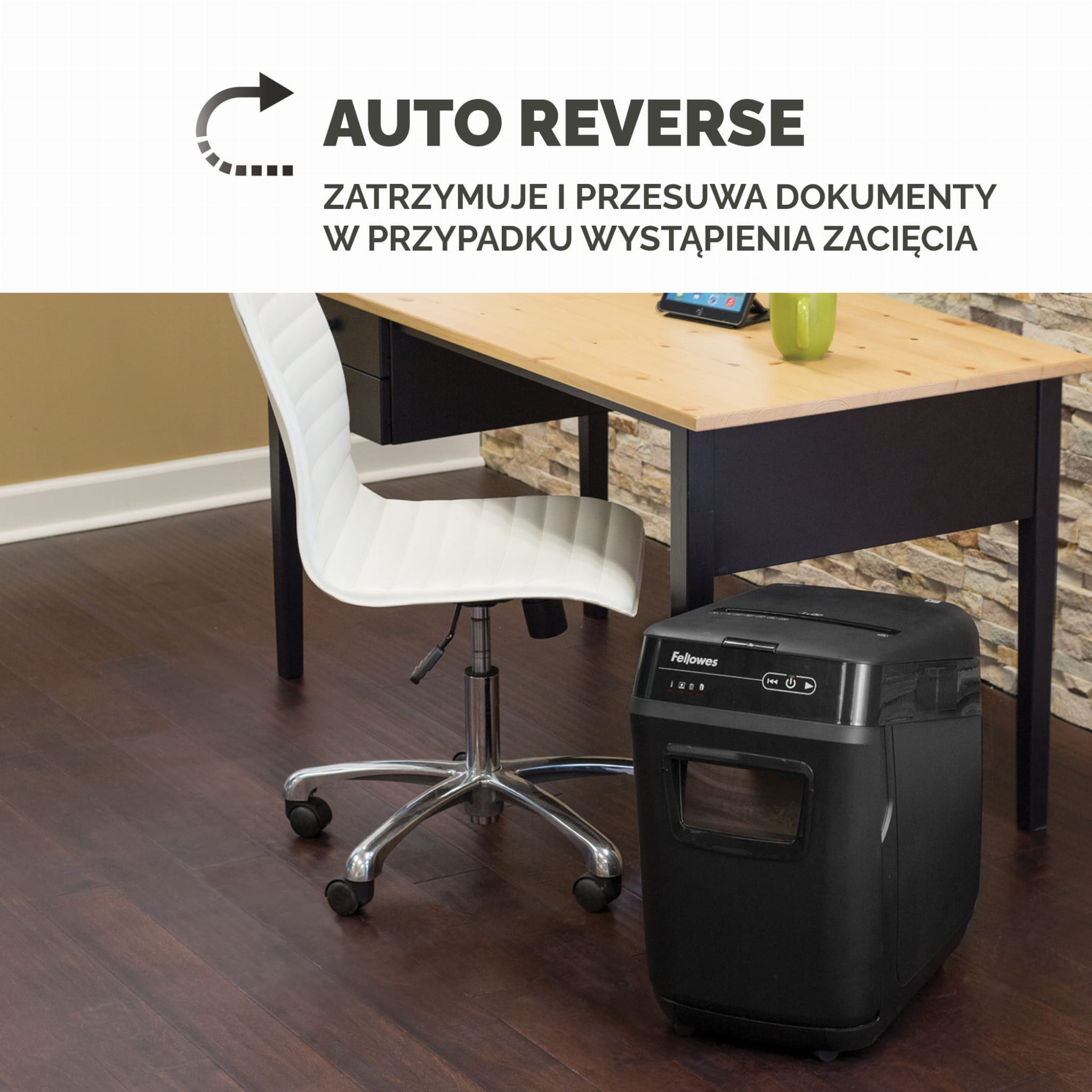- Brak uciążliwych zacięć dzięki systemowi Auto Reverse - w przypadku zacięcia dokumentów niszczarka Fellowes Automax 200M wstępnie wycofa dokumenty.