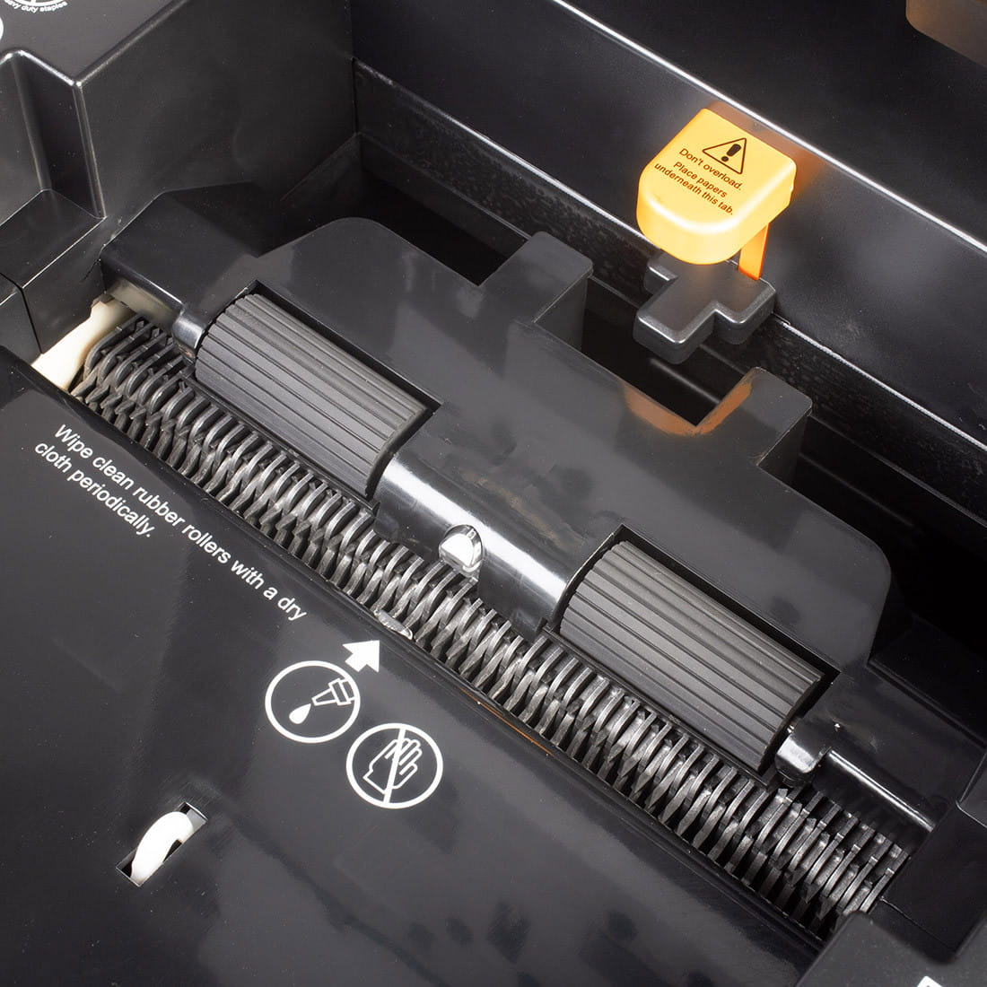 Niszczarkę obsłużysz w prosty sposób za pomocą intuicyjnego podświetlanego panelu. Znajdziesz na nim przyciski takie jak: włącz/wyłącz (uruchamia tryb automatyczny niszczarki); rewers (szybkie wycofanie dokumentu); „do przodu” (pomocny np. podczas oliwienia niszczarki). Na panelu znajdują się także wskaźniki LED, które podświetlają się na czerwono, gdy dochodzi do przegrzania lub przeciążenia urządzenia, drzwiczki niszczarki są otwarte, kosz na ścinki jest przepełniony lub wystąpił błąd podajnika.