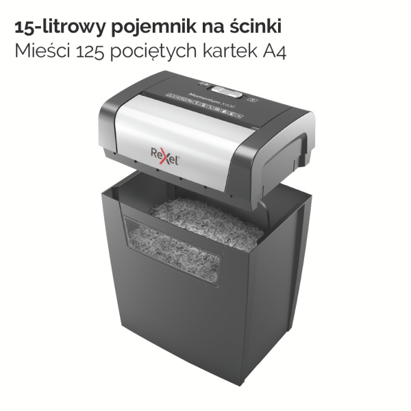 - 15-litrowy pojemnik na ścinki pomieści do 125 pociętych kartek A4