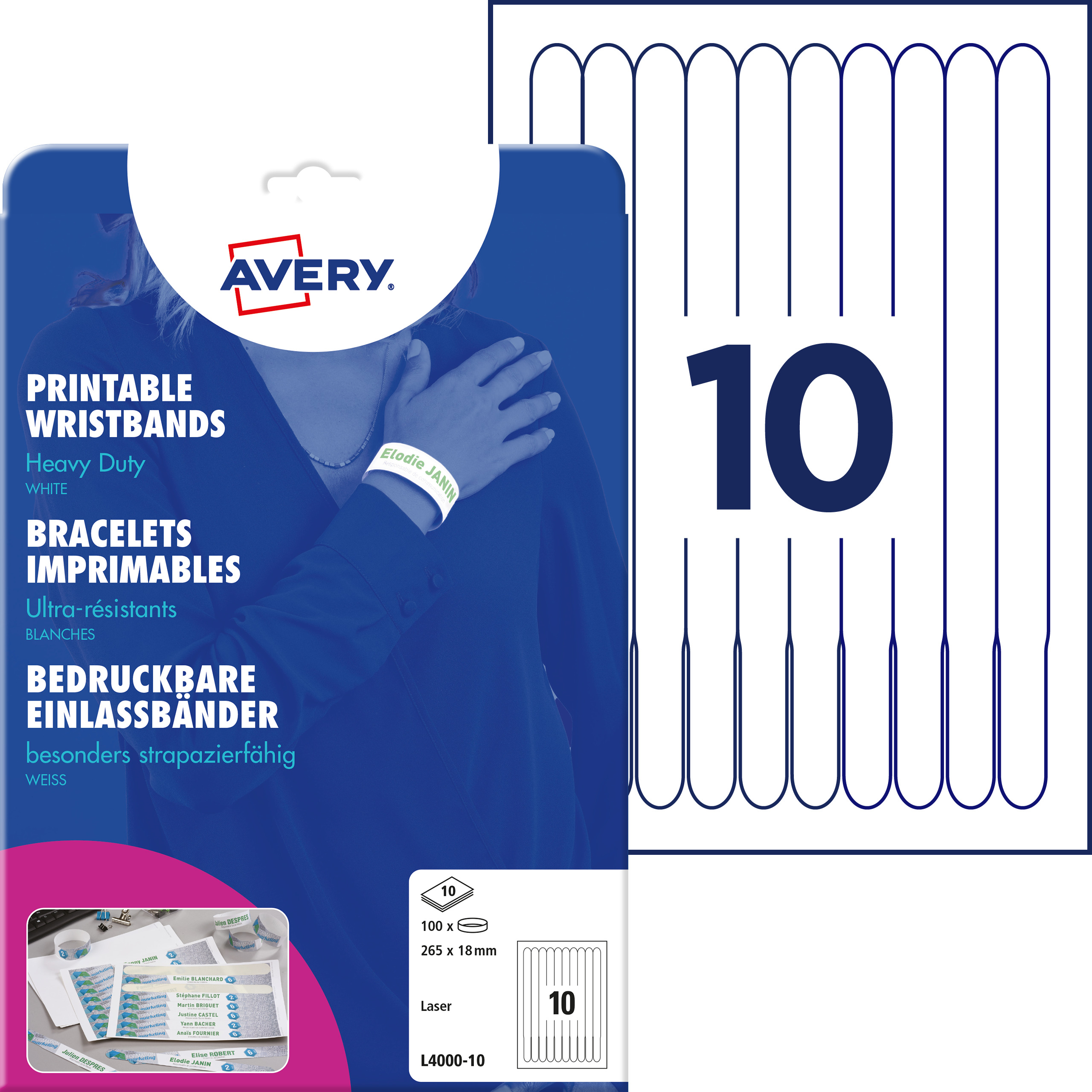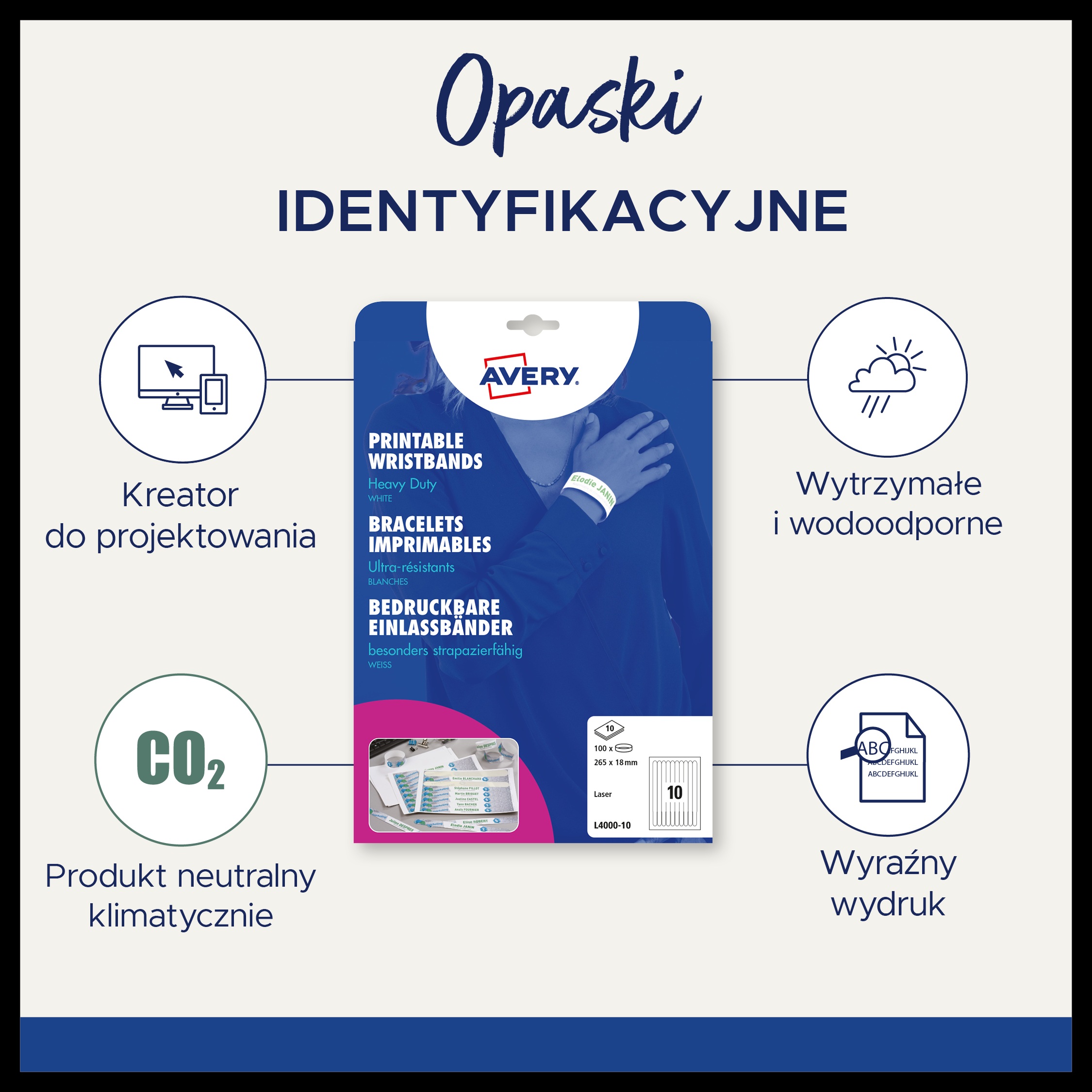 Opaski identyfikacyjne na nadgarstki do zadruku, folia Avery L4000-10 / 265 x 18 mm, A4, 10 arkuszy - biały