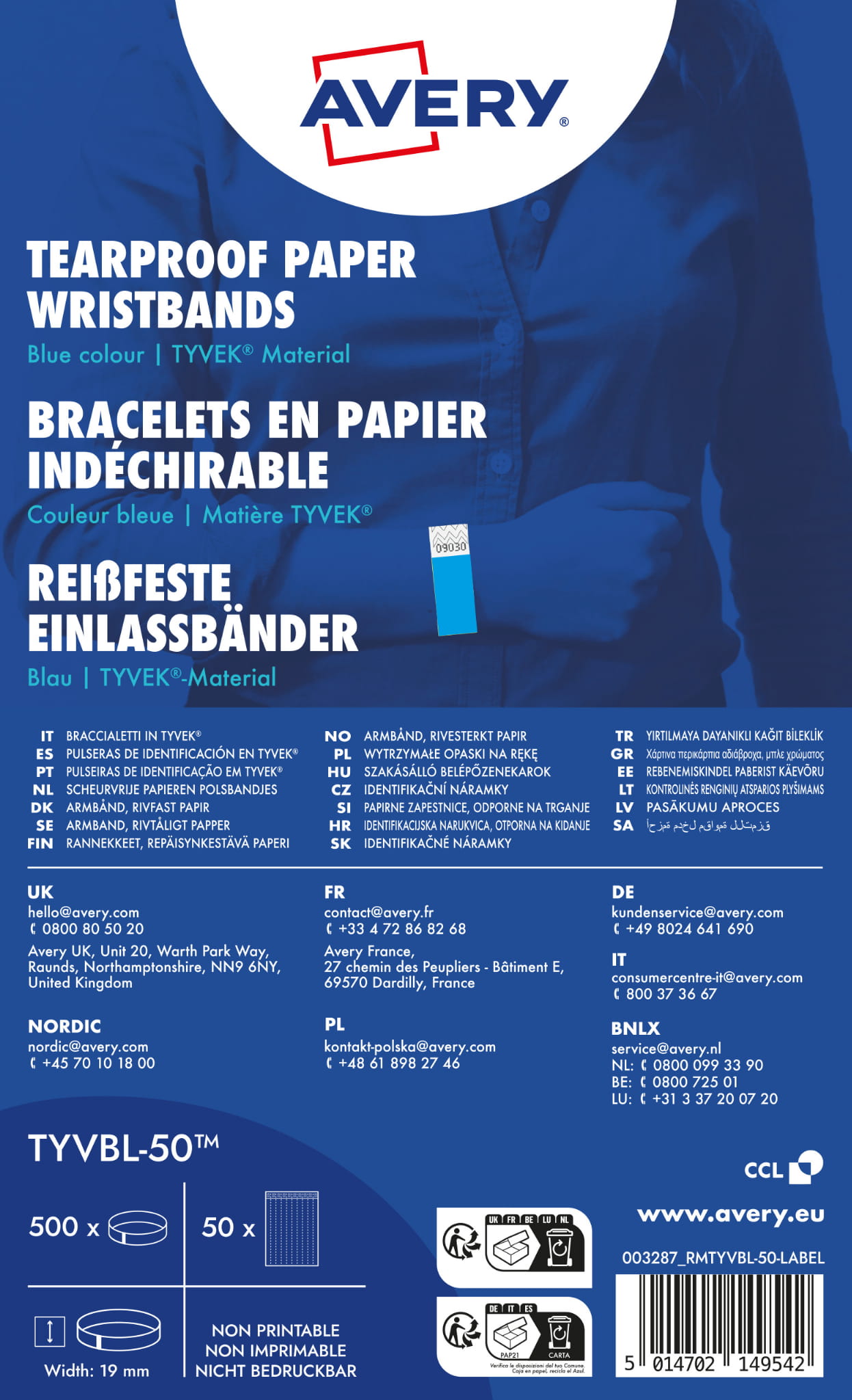 Opaski na rękę Avery Zveckform odporne na rozdarcia TYVEK® - TYVBL-50 - 19 x 256 mm,50 arkuszy - niebieskie