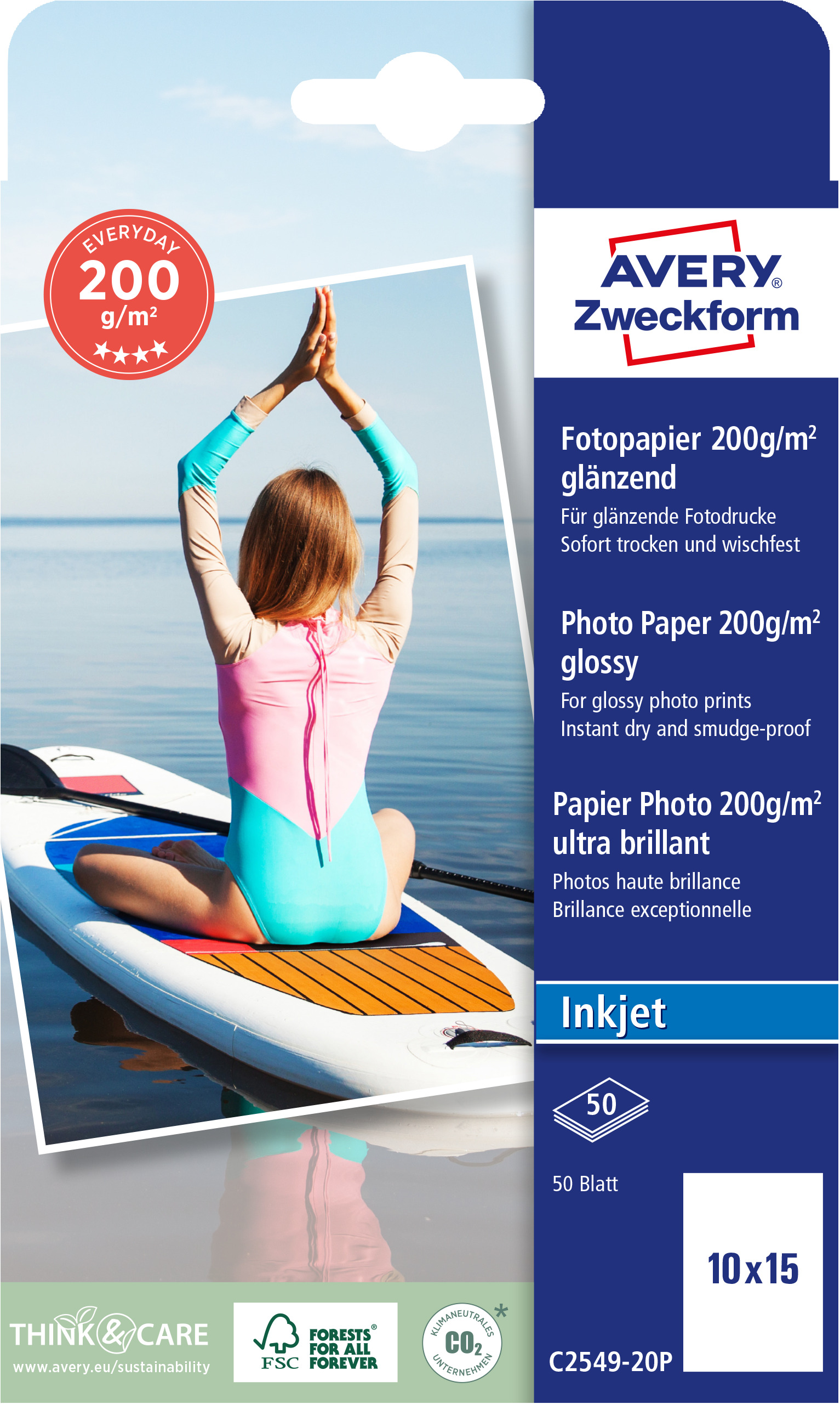 Papier fotograficzny Everyday do drukarki, Avery C2549-20P / 100 x 150 mm, 200 g, 50 arkuszy, błyszczący - biały
