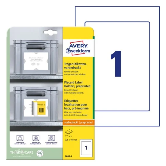 Podkładki pod etykiety Avery Zweckform 8003-5 w formacie 220 x 160 mm. Pewnie i niezawodnie przylegają do różnego rodzaju powierzchni, np. z tworzyw sztucznych. Idealnie nadają się do oznaczania w magazynach, w branżach logistycznych, w sektorach handlu detalicznego, hotelarstwie, biurach, a także w gospodarstwach domowych. 5 podkładek/opakowanie.