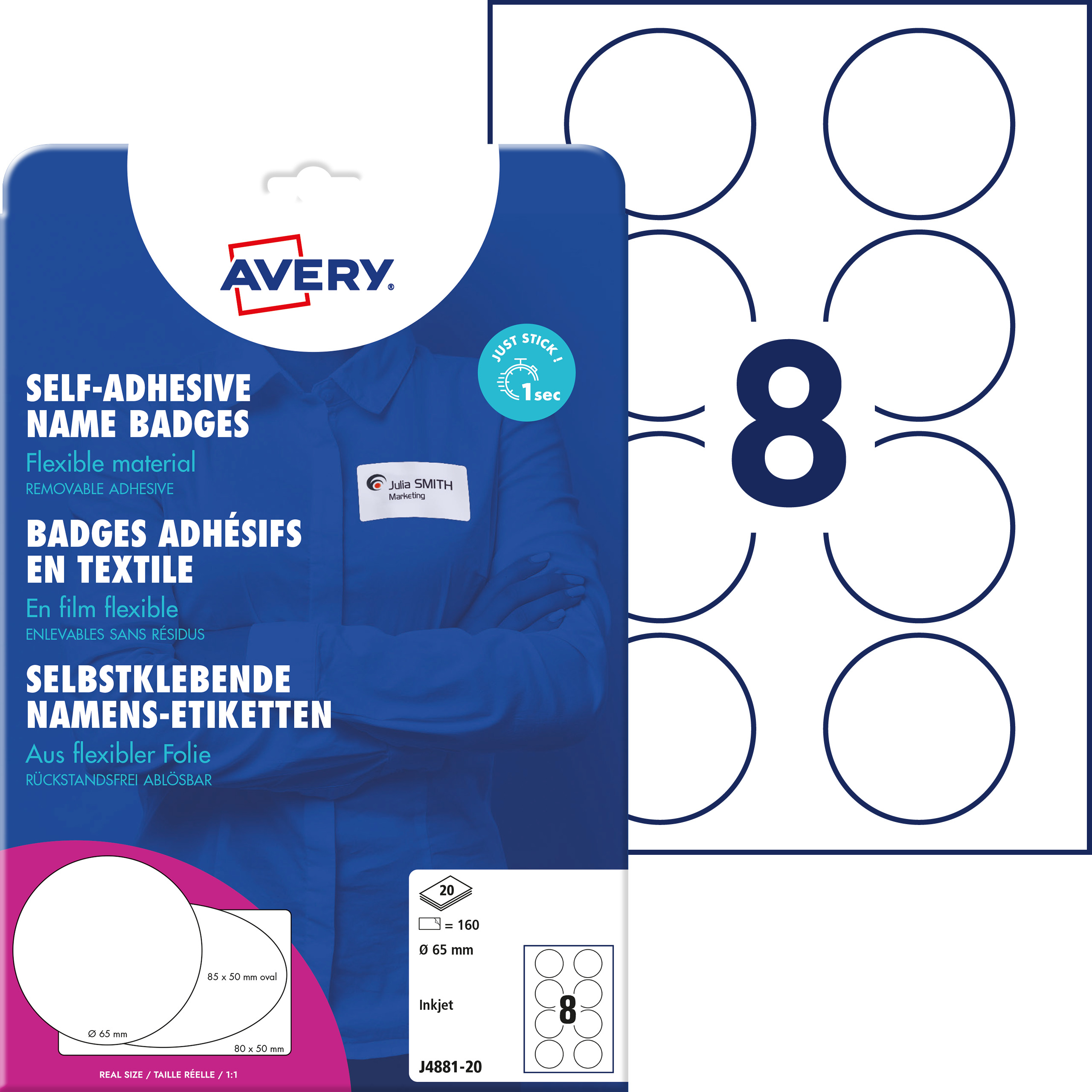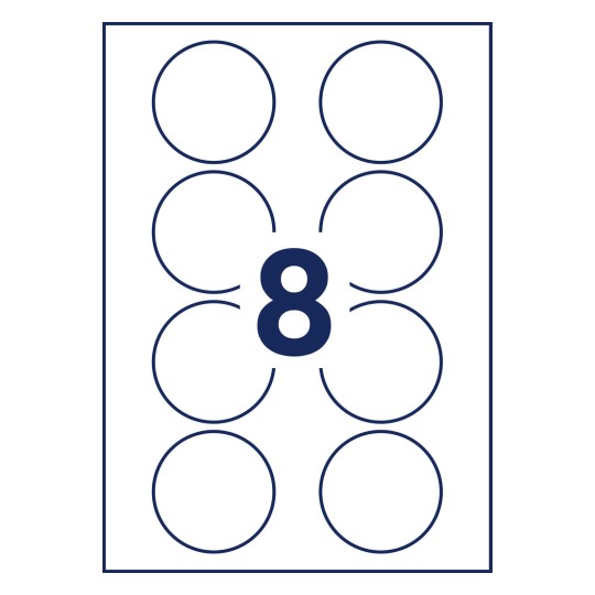 Samoprzylepne identyfikatory do zadruku, folia Avery J4881-20 / okrągłe Ø 65, A4, 20 arkuszy - biały