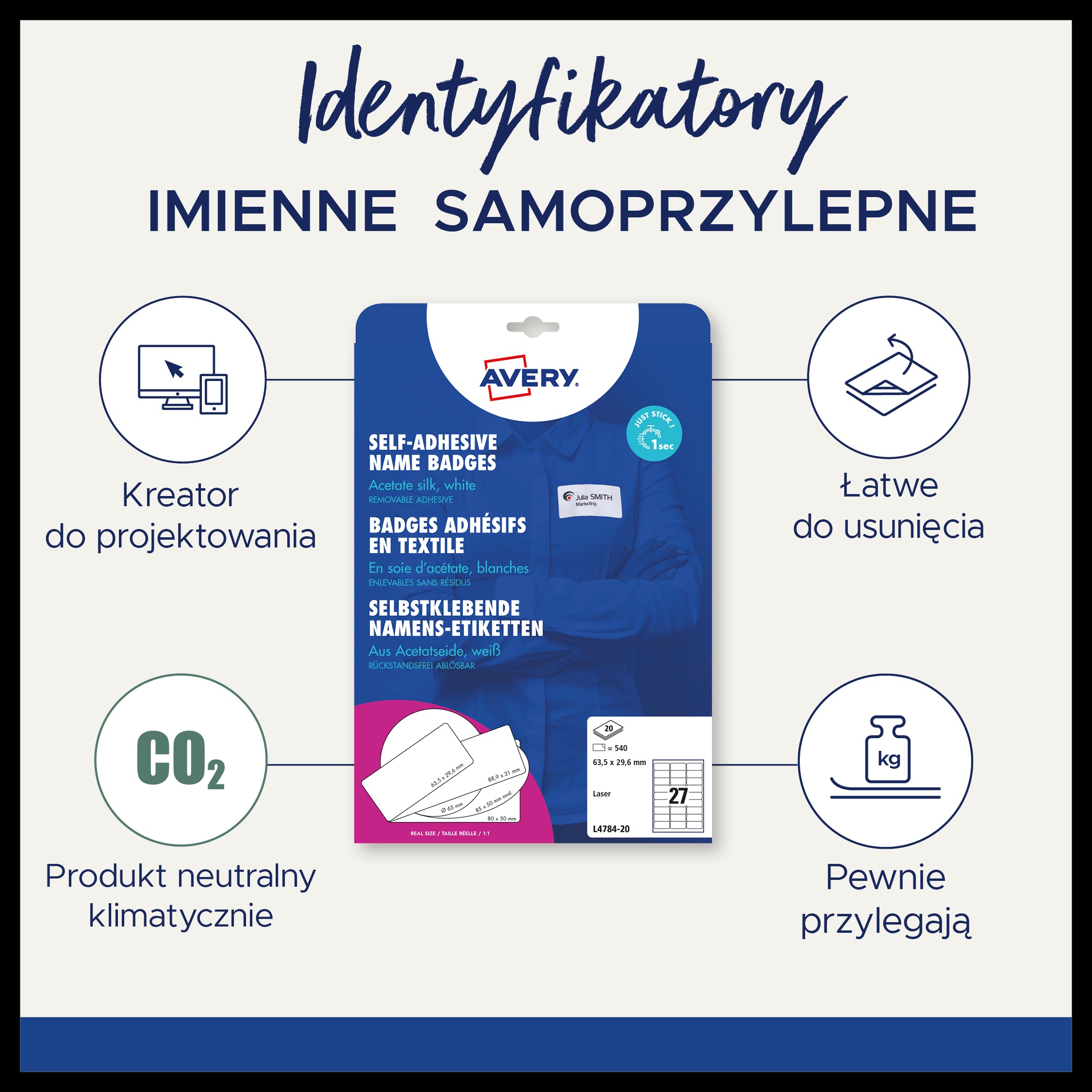 • Produkcja identyfikatorów Avery Zweckform jest neutralna pod względem emisji CO2 (certyfikat Focus Future) i zgodna ze standardem ISO14001, który pomaga zminimalizować negatywne czynniki oddziałujące na środowisko naturalne.