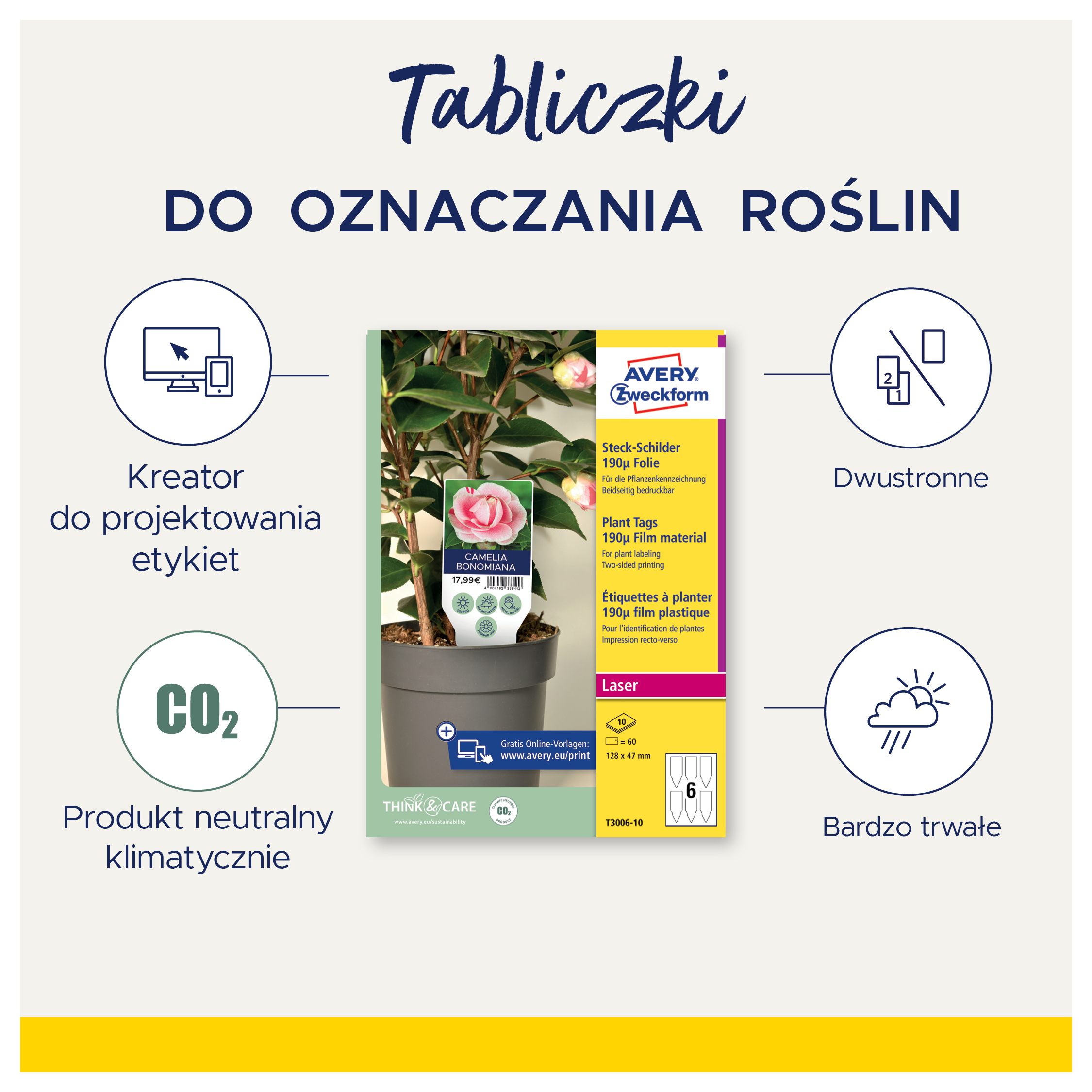 • Think & Care – Firma Avery Zweckform od 2020 roku jest neutralna dla klimatu: emisje gazów cieplarnianych w zakładzie firmy są równoważone przez certyfikowane projekty ochrony klimatu. Od 2014 roku wykorzystywana jest wyłącznie ekologiczna energia elektryczna/gaz. Badania, rozwój, produkcja, logistyka oraz administracja w siedzibie firmy w Oberlaindern w Bawarii gwarantują najwyższe standardy jakości i ochrony środowiska oraz krótkie trasy dostaw. Tabliczki foliowe są produkowane w sposób neutralny dla klimatu, a emisja gazów cieplarnianych z materiału jest kompensowana.