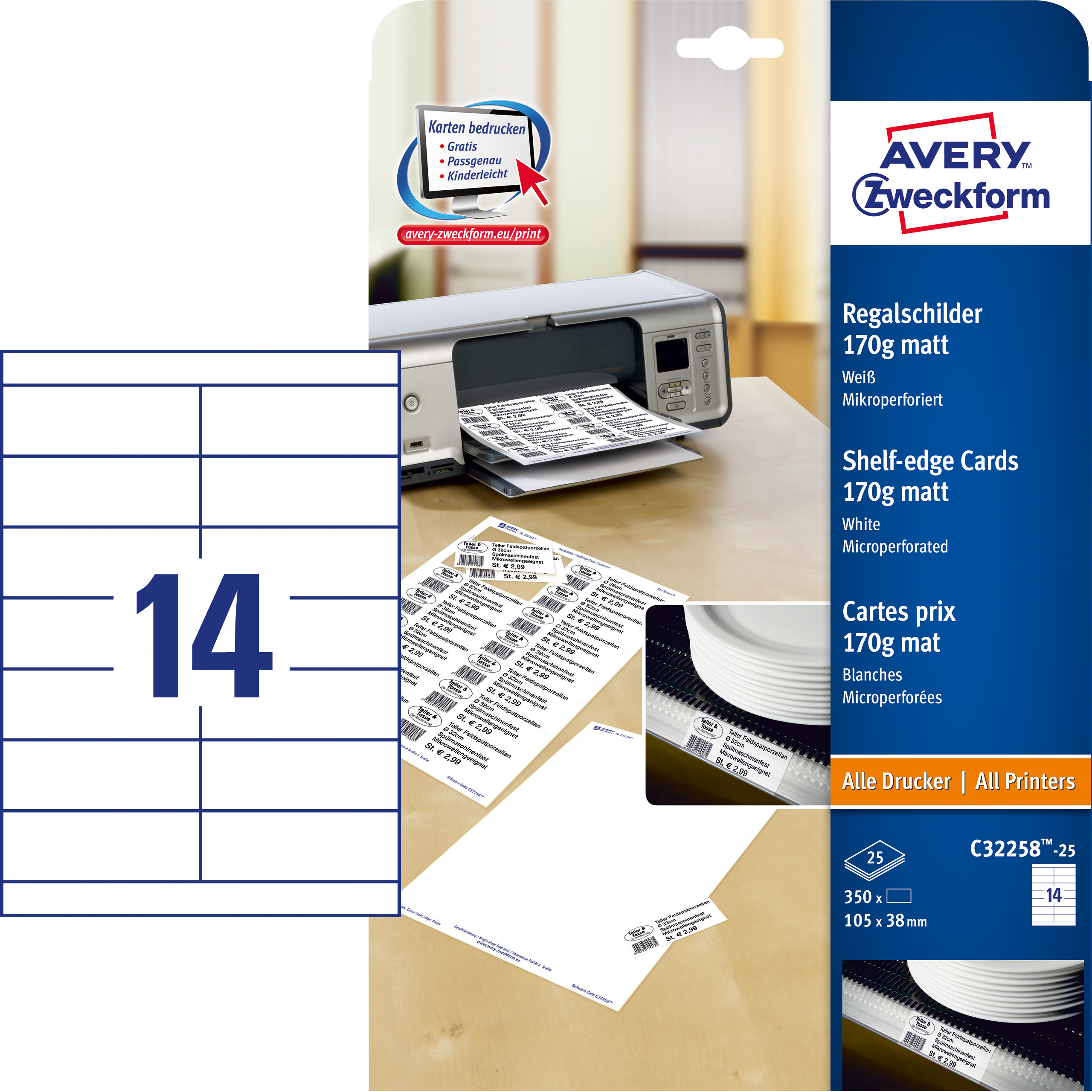 Tabliczki regałowe Avery C32258-25 / 105 x 38 mm, 350 szt., 25 arkuszy, 170 g, matowe - biały