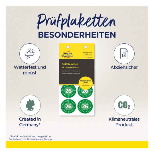 Think & Care — program zrównoważonego rozwoju wdrożony przez Avery Zweckform. Firma jest neutralna dla klimatu: od 2014 roku wykorzystywana jest wyłącznie ekologiczna energia elektryczna/gaz. Badania, rozwój, produkcja, logistyka i administracja w siedzibie firmy w Oberlaindern w Bawarii gwarantują najwyższe standardy jakości i ochrony środowiska, a także optymalny system dostaw. Od 2020 r. emisje gazów cieplarnianych w zakładzie produkcyjnym są także kompensowane przez certyfikowane projekty ochrony klimatu. Etykiety inspekcyjne wykonane z wytrzymałej folii są produkowane w sposób neutralny dla klimatu.