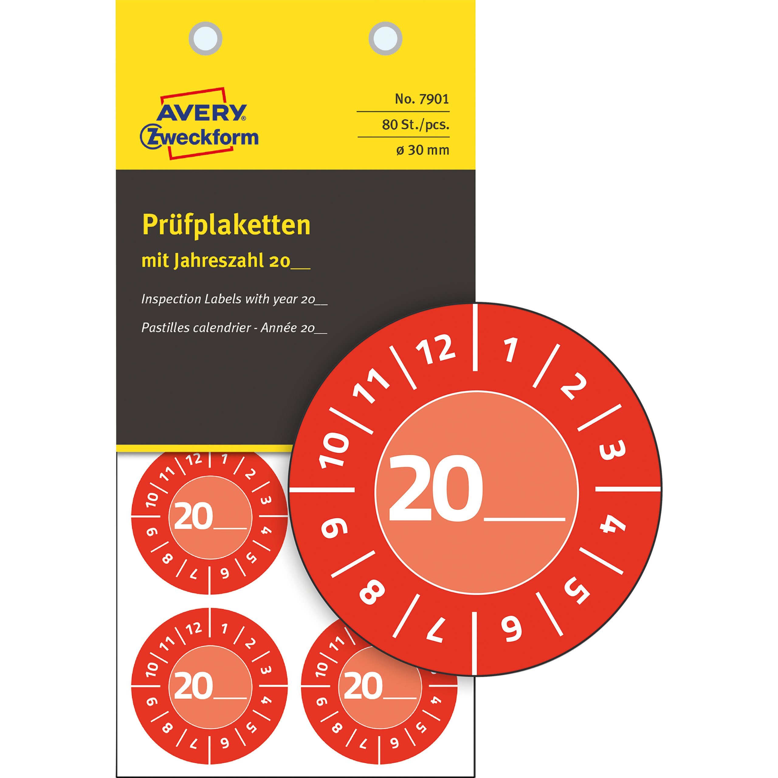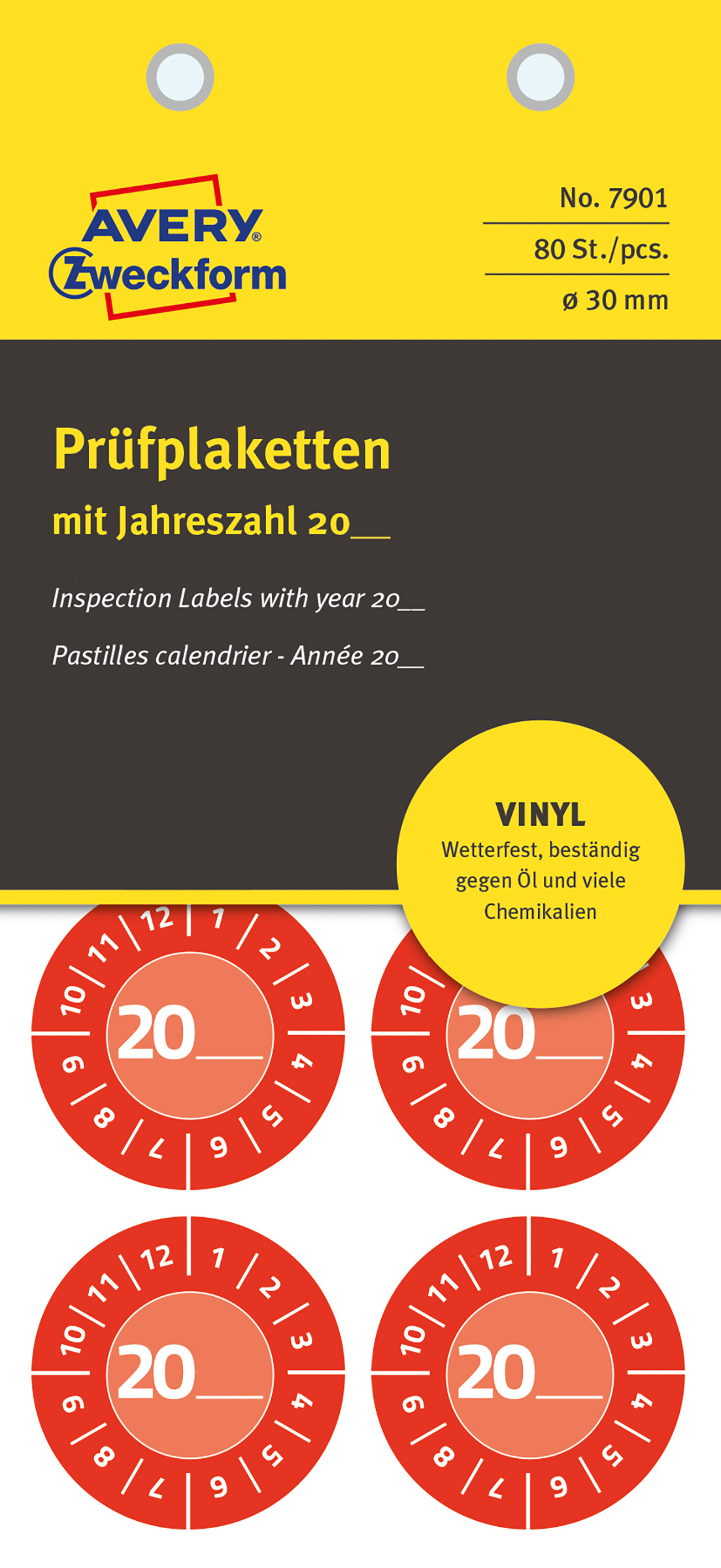 • Czerwone tabliczki inspekcyjne w okrągłym formacie od Avery Zweckform są bardzo wytrzymałe i odporne na czynniki atmosferyczne.