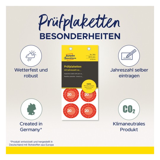 Think & Care — program zrównoważonego rozwoju wdrożony przez Avery Zweckform. Firma jest neutralna dla klimatu: od 2014 roku wykorzystywana jest wyłącznie ekologiczna energia elektryczna/gaz. Badania, rozwój, produkcja, logistyka i administracja w siedzibie firmy w Oberlaindern w Bawarii gwarantują najwyższe standardy jakości i ochrony środowiska, a także optymalny system dostaw. Od 2020 r. emisje gazów cieplarnianych w zakładzie produkcyjnym są także kompensowane przez certyfikowane projekty ochrony klimatu. Etykiety inspekcyjne wykonane z wytrzymałej folii są produkowane w sposób neutralny dla klimatu.