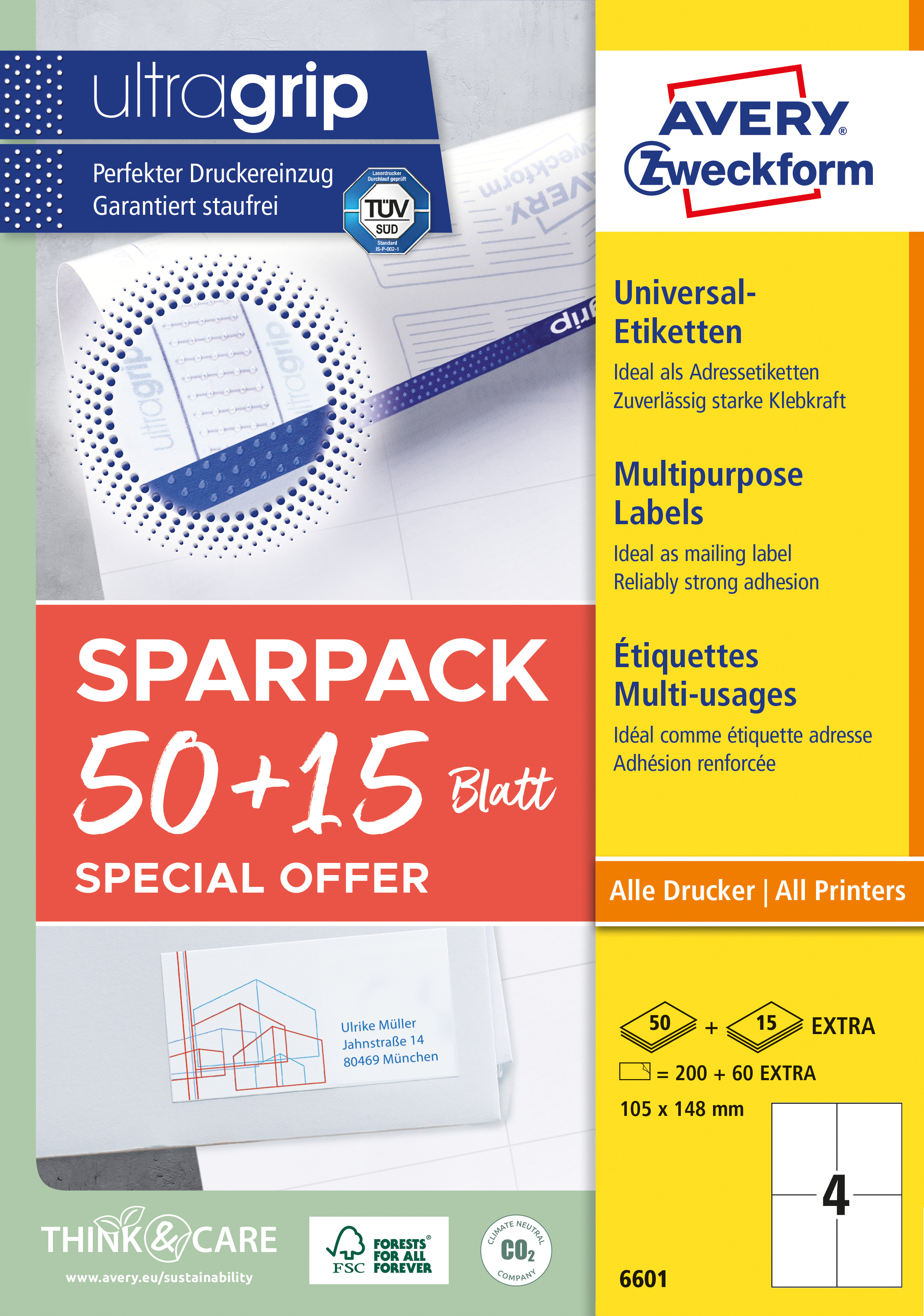 Trwałe etykiety papierowe 105 x 148 mm, białe etykiety samoprzylepne, etykiety do druku 65 ark. / op., Avery 6601