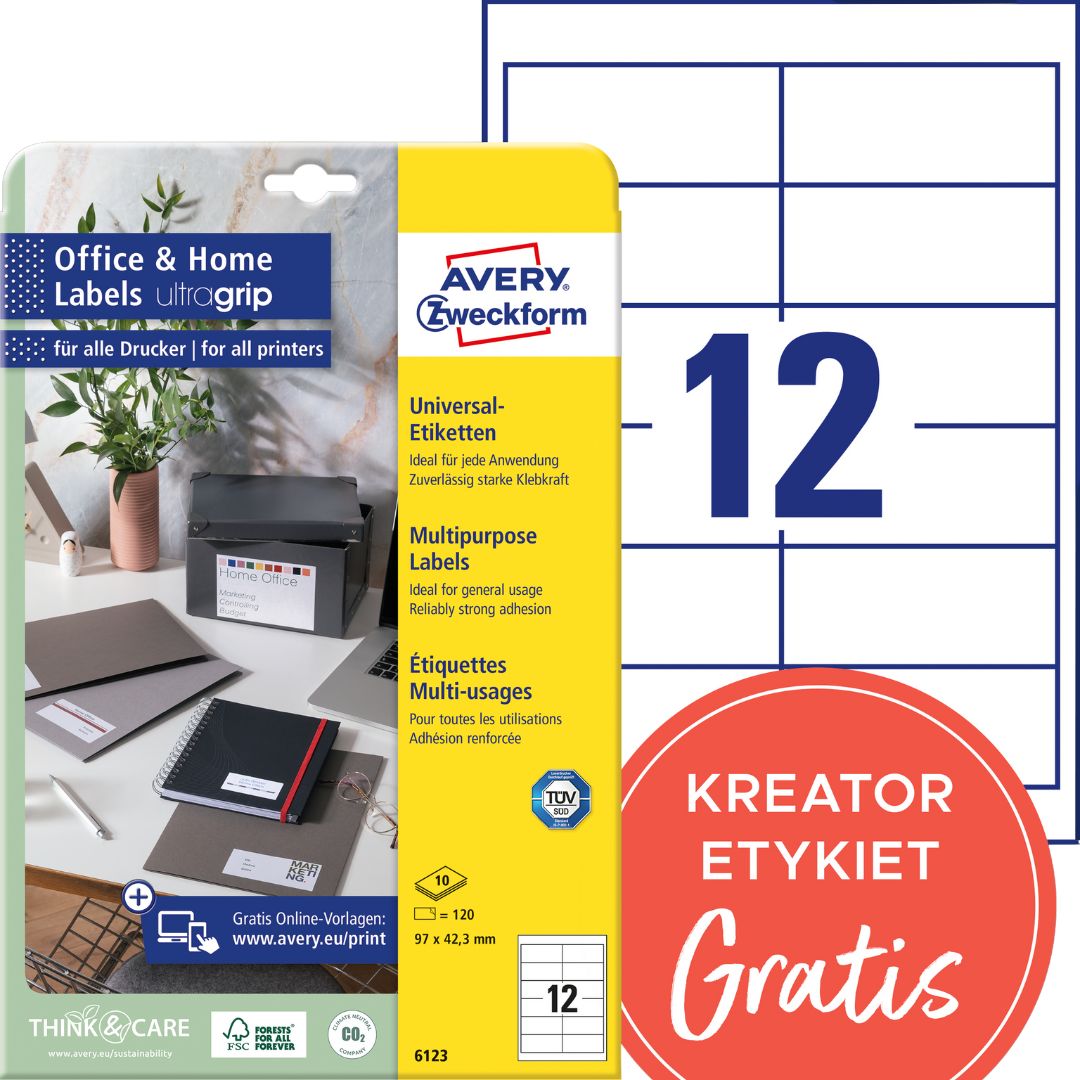 Trwałe etykiety papierowe 97 x 42,3 mm, białe etykiety samoprzylepne, etykiety do druku 10 ark. / op., Avery 6123