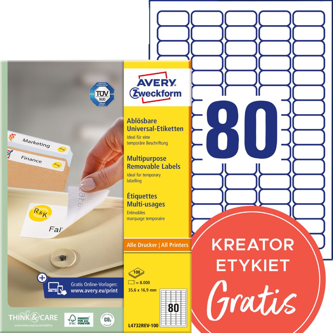 Usuwalne etykiety papierowe 35,6 x 16,9 mm, białe etykiety samoprzylepne, etykiety do druku 100 ark. / op., Avery L4732REV-100