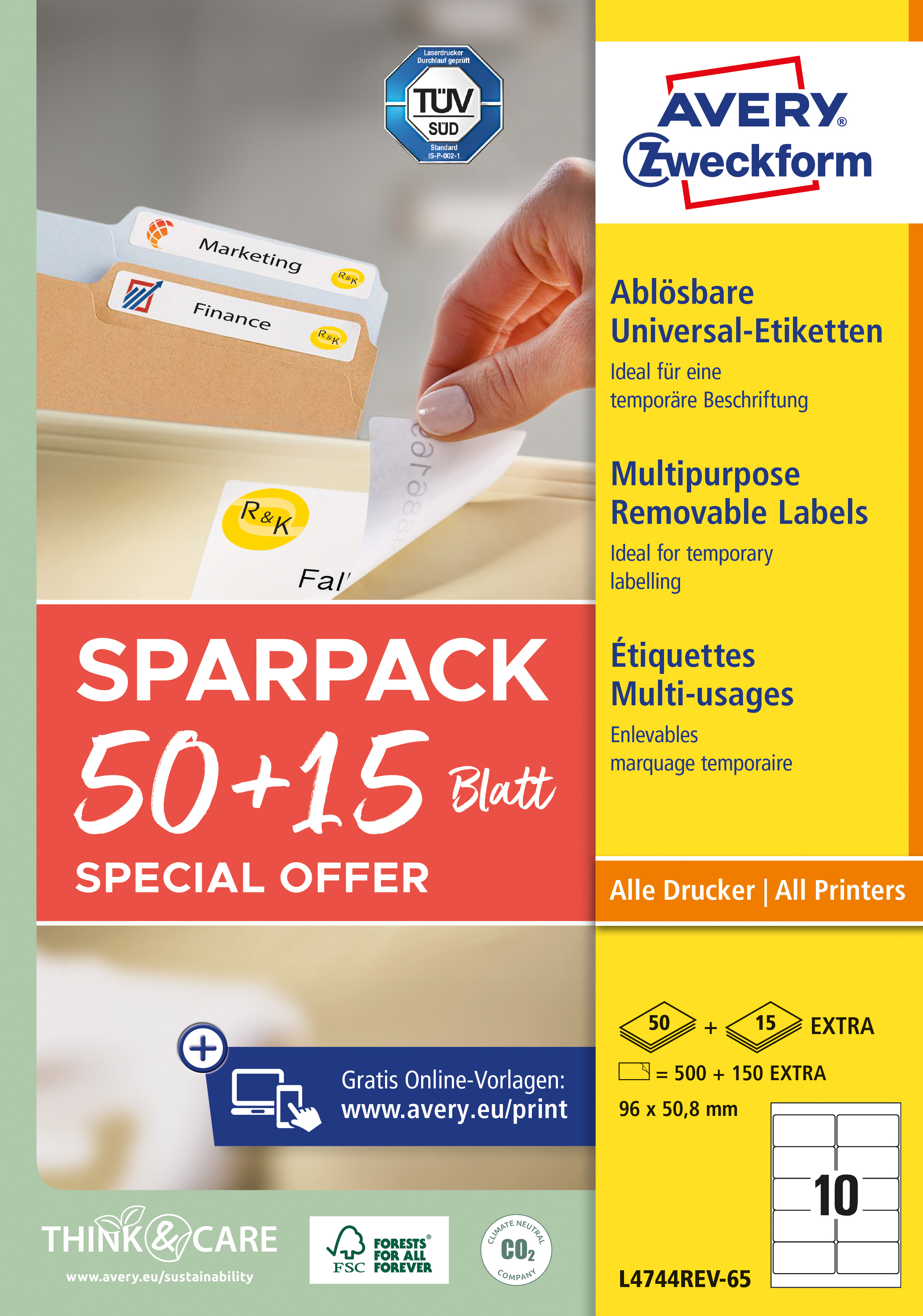 Usuwalne etykiety papierowe 96 x 50,8 mm, białe etykiety samoprzylepne, etykiety do druku 65 ark. / op., Avery L4744REV-65