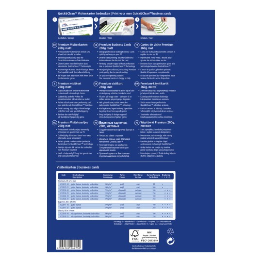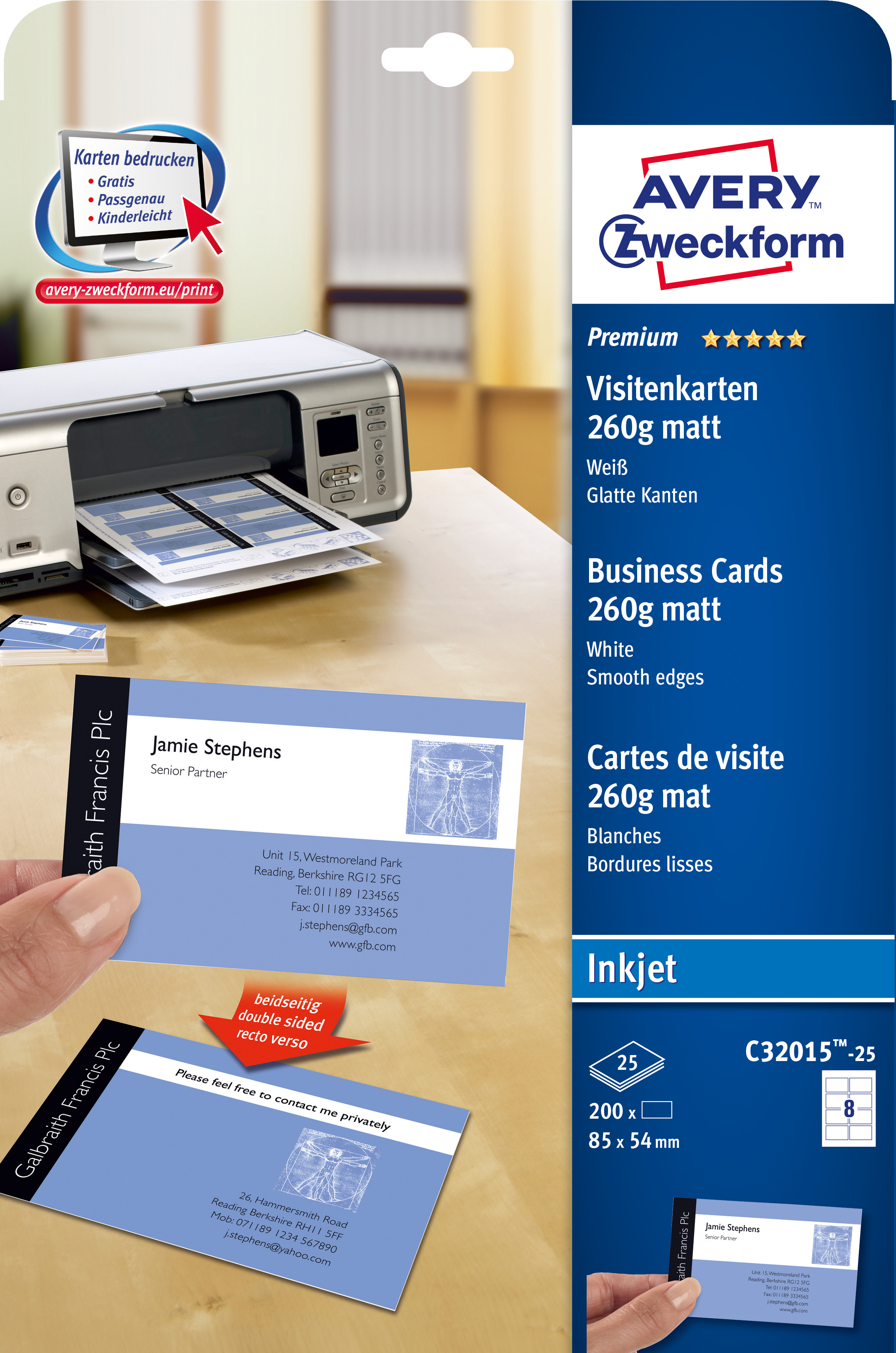 Wizytówki do druku dwustronne Quick & Clean Avery C32015-25 / 85 x 54 mm, 200 szt., 25 arkuszy, 260 g, matowe - biały